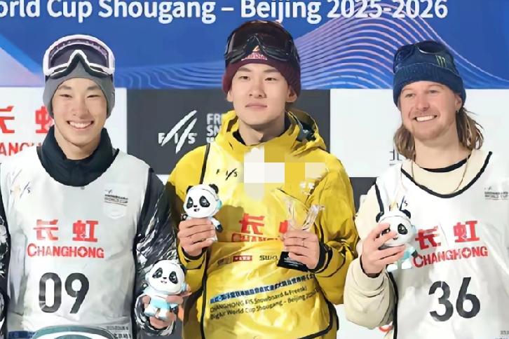 不得不说亚洲人的基因就是显小, 这冠亚季军看着就像两代人。 旁边的白人一脸胡子拉碴, 看着也太沧桑了。 极限运动年纪大的也玩不了, 参赛者的年龄最大也就二三十岁, 但是这个老哥看着像四十多岁。 巧合的是, 苏翊鸣和旁边的亚洲人长相也很相似, 都是单眼皮、高鼻梁, 看着像兄弟, 是不是极限运动玩得好的, 都是这种长相?