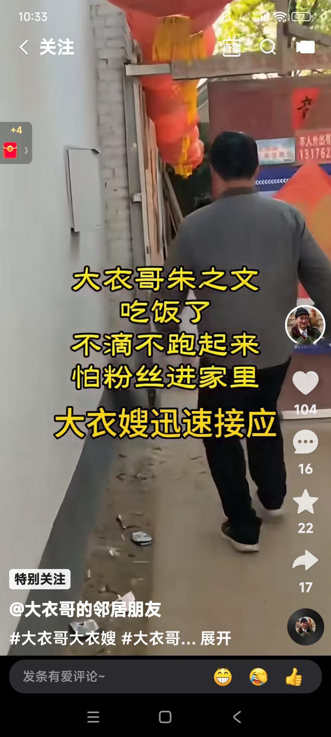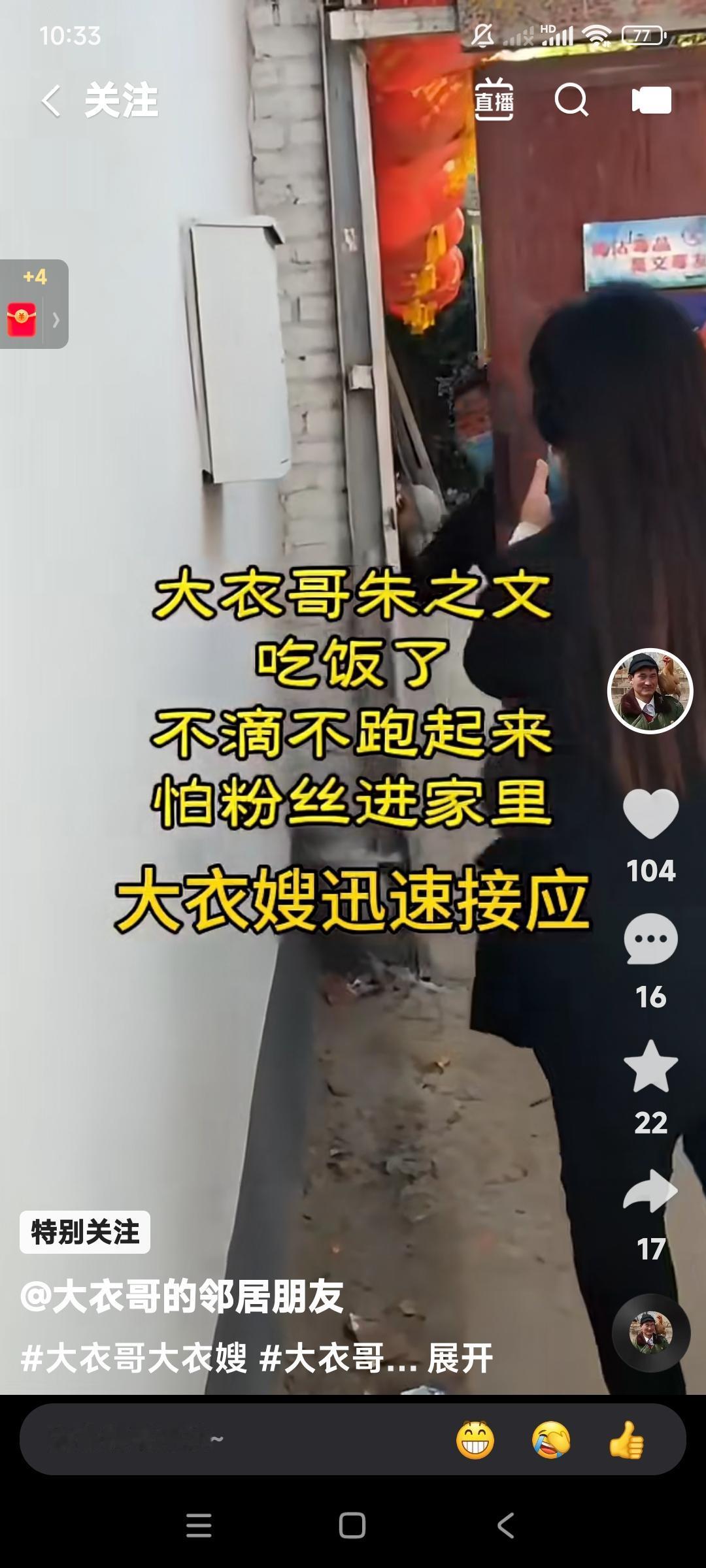 这就是明星家庭的困惑。 大衣哥朱之文,回家吃饭。 后边儿一大群粉丝要拍视频。 大衣哥朱之文。害怕这帮粉丝跟踪,赶紧跑到家。 大衣嫂在门口儿接应,没等粉丝进门儿,赶紧关上门。 避免了这帮粉丝进门骚扰。