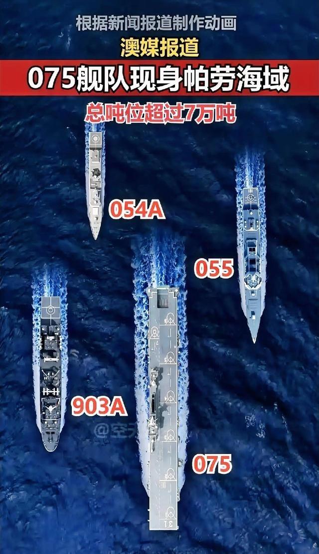 南下去澳大利亚的075编队最大的薄弱环节是什么?055大驱防空反潜能力都是一流,054A作为补充力量,提供中程防空反潜火力。903A是补给舰,很重要但战斗力有限。所以,这支编队最大的短板是远程空中预警能力。 最近这段时间,中国海军一支编队现身菲律宾海,靠近帕劳海域,引起澳大利亚那边高度关注。编队以075型两栖攻击舰海南舰为主力,配055型万吨大驱延安舰、一艘054A护卫舰和903A型补给舰骆马湖舰,总吨位接近8万吨。国防部发言人明确表态,这属于常规远海训练,符合国际法,不针对任何国家。 055大驱的防空反潜水平已经顶尖,112个垂发单元,双波段雷达,火力覆盖广。054A护卫舰补位中近程防空和反潜,挂载中程导弹和反潜鱼雷,整体护航能力强。903A补给舰负责油料和物资保障,让编队续航力大幅延长。这种组合在水面作战和反潜上基本没明显漏洞,火力和防护都够硬。 这支编队在远洋环境下,最明显的短板还是远程空中预警。075型能带30架左右直升机,包括预警型直升机,比如改装的直-18或直-20预警变种。这些直升机雷达能提供一定空中警戒,但受限于平台速度和高度,探测距离一般在200-300公里左右,留空时间也短,只能轮换值班。相比固定翼预警机,比如E-2那种,巡航高度高、速度快、续航长,探测范围轻松超400公里,还能空中加油持续盯梢。 远海行动中,编队主要靠舰载雷达扫描,但雷达视野受地球曲率影响,低空目标容易漏网。直升机预警虽灵活,能填补部分空白,但覆盖广度和持久性跟不上。澳大利亚出动P-8A巡逻机监视时,编队就得靠直升机应对,距离一拉开,情报获取就吃力。如果遇到复杂情况,多方向威胁,预警链条容易断档。 这个短板不是编队独有,中国海军整体远洋编队都面临类似问题。航母带固定翼预警机能解决,但075这种两栖编队专注立体投送,暂时还得靠直升机过渡。未来076型上电磁弹射,可能带固定翼无人机或小型预警机,情况会好转。现在阶段,远程空中预警确实是最大制约,影响编队在广阔洋面上的态势感知和反应速度。 澳大利亚反应这么大,一方面是上半年055编队刚绕过一圈,给他们留了阴影,这次又来075,吨位更大、投送能力更强,自然坐不住。澳媒直说这支编队火力超整个澳海军,担心再被“套圈”。但从实际看,编队还在几千公里外,纯属训练性质。中国海军远洋活动越来越常态化,南太平洋出现中国舰艇,本来就正常。 总的来说,这支编队实力已经很强,水面和水下防护一流,补给也跟上,但远程预警这个点,还需时间补齐。海军发展快,类似训练多搞几次,经验积累起来,短板会逐步缩小。远海练兵,就是为了把能力练实,把弱项补上。