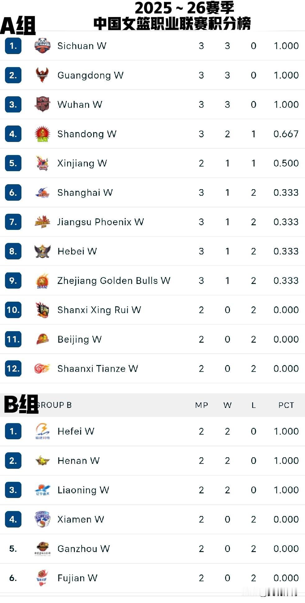 2025~26赛季中国女篮职业联赛积分榜 A组 1.四川W 2.广东W 3.武汉W (以上三队三战三胜) 4.山东W 5.新疆W (以上两队二胜一负) 6.上海W 7.江苏凤凰W 8.河北W 9.浙江金牛W (以上四队一胜两负) 10.山西兴瑞W 11.北京W 12.陕西天泽W (以上三队两战皆负) B组 1.合肥W 2.河南W 3.辽宁W 4.厦门W 5.赣州W 6.福建W A组全部球队和B组前四名进入季后赛。