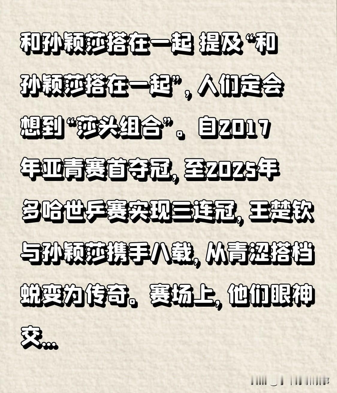 和孙颖莎搭在一起 提及“和孙颖莎搭在一起”,人们定会想到“莎头组合”。自2017年亚青赛首夺冠,至2025年多哈世乒赛实现三连冠,王楚钦与孙颖莎携手八载,从青涩搭档蜕变为传奇。 赛场上,他们眼神交汇便能调整发球,王楚钦反手拧拉配合孙颖莎正手弧圈,攻防默契,是国乒混双的定海神针。他们共历奥运首金、大满贯卫冕,低谷相扶,巅峰同庆。这不仅是胜负之争,更是温暖情谊,是共同成长为国乒支柱的热血时光。