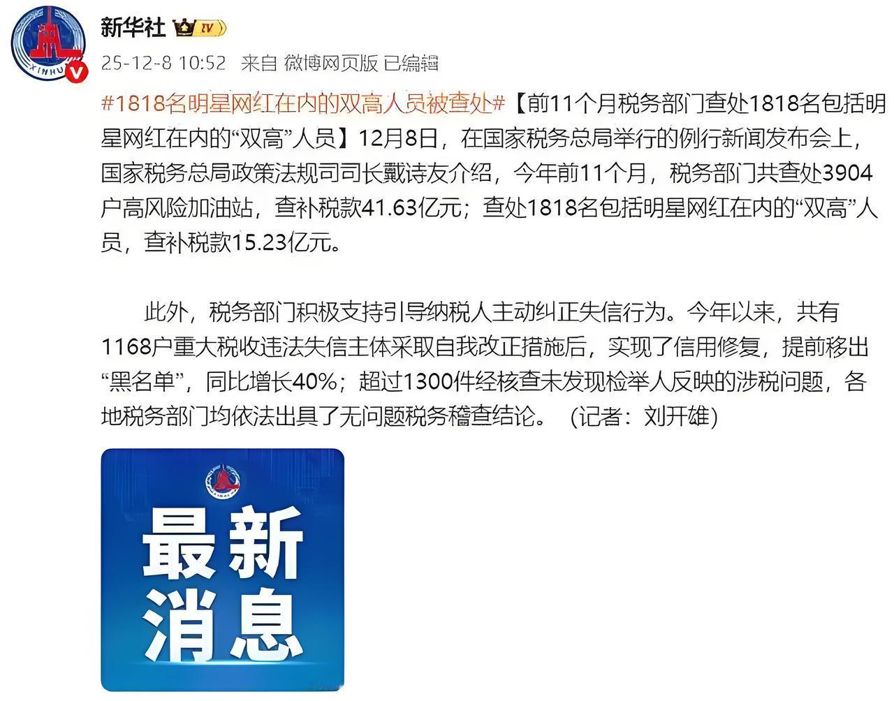 明星网红能顶半边天呐!国家税务总局刚公布,今年前11个月,税务部门一共查处了1818个包括明星、网红在内的人,光补收的税款就有15.23亿元。 说实话,这些明星网红真能赚钱,补税都能补上亿元,难怪很多人挤破头都想当明星、做网红。 但也想劝劝那些还没报税的,趁还没查到自己头上,赶紧补税吧!大v逃税 主播公司偷税