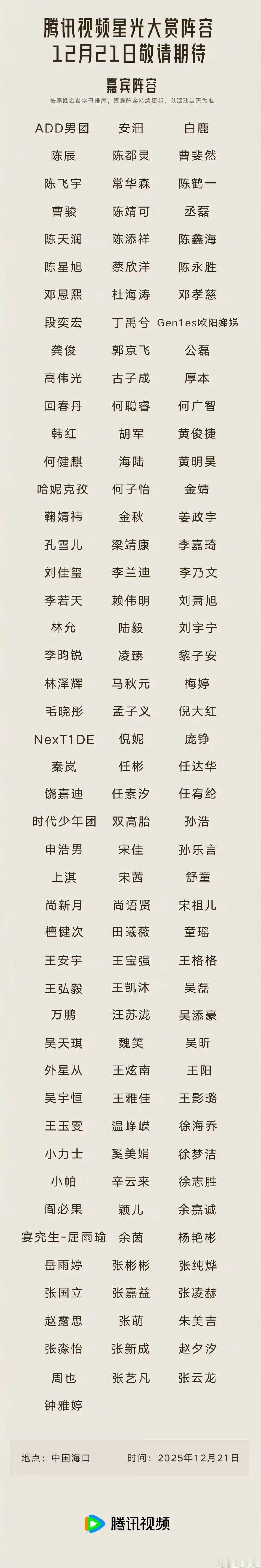 白鹿、鞠婧祎、赵露思、檀健次、陈都灵、陈飞宇、常华森、丞磊、陈星旭、丁禹兮、龚俊、黄俊捷、黄明昊、刘宇宁、李昀锐、孟子义、倪妮、时代少年团、宋茜、宋祖儿、田曦薇、王安宇、吴磊、汪苏泷、王玉雯、辛云来、张凌赫人好多星光大赏阵容官宣腾讯视频星光大赏