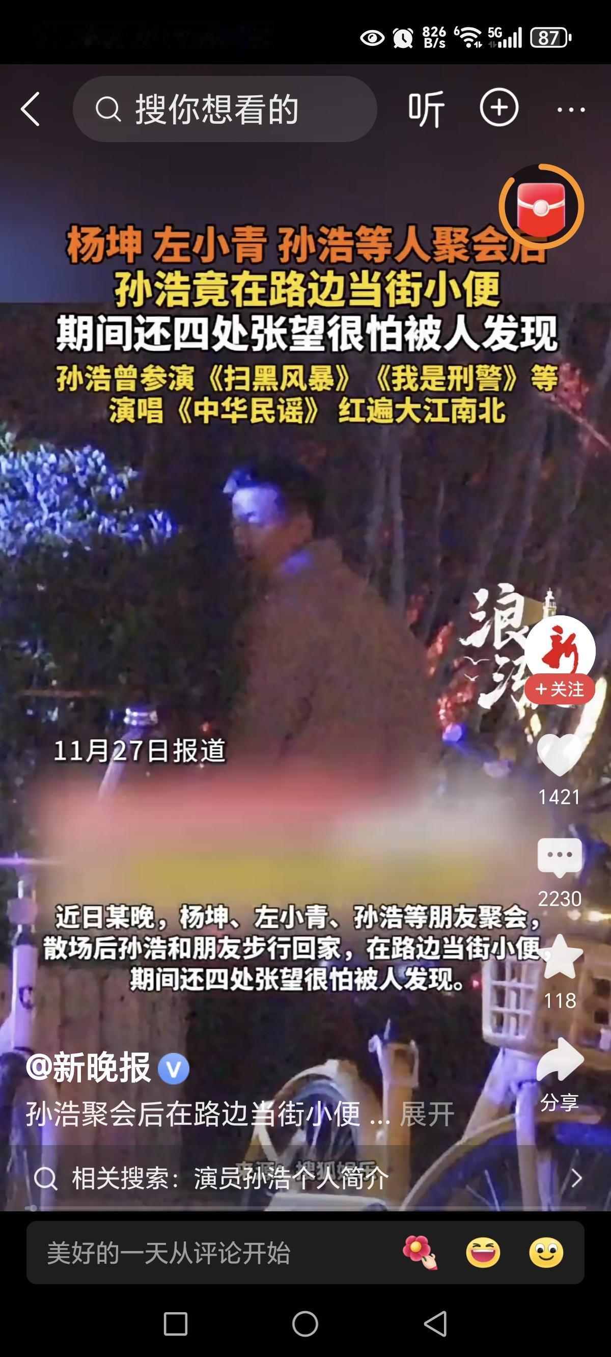 演员孙浩聚会后在路边当街解手这种事是普通人生活中的常事,被人发现了会嗤之以鼻的说句“这人没素质!”,很少上刚上线的。但作为公众人物的明星类群体就不一样了。公众本身是对“素质”有着考量的,不闻不问不评的淡起来,谁来提高素质?明星之所以被追捧是因为他(她)是公众看好的榜样,榜样没素质是件烧脑的事!