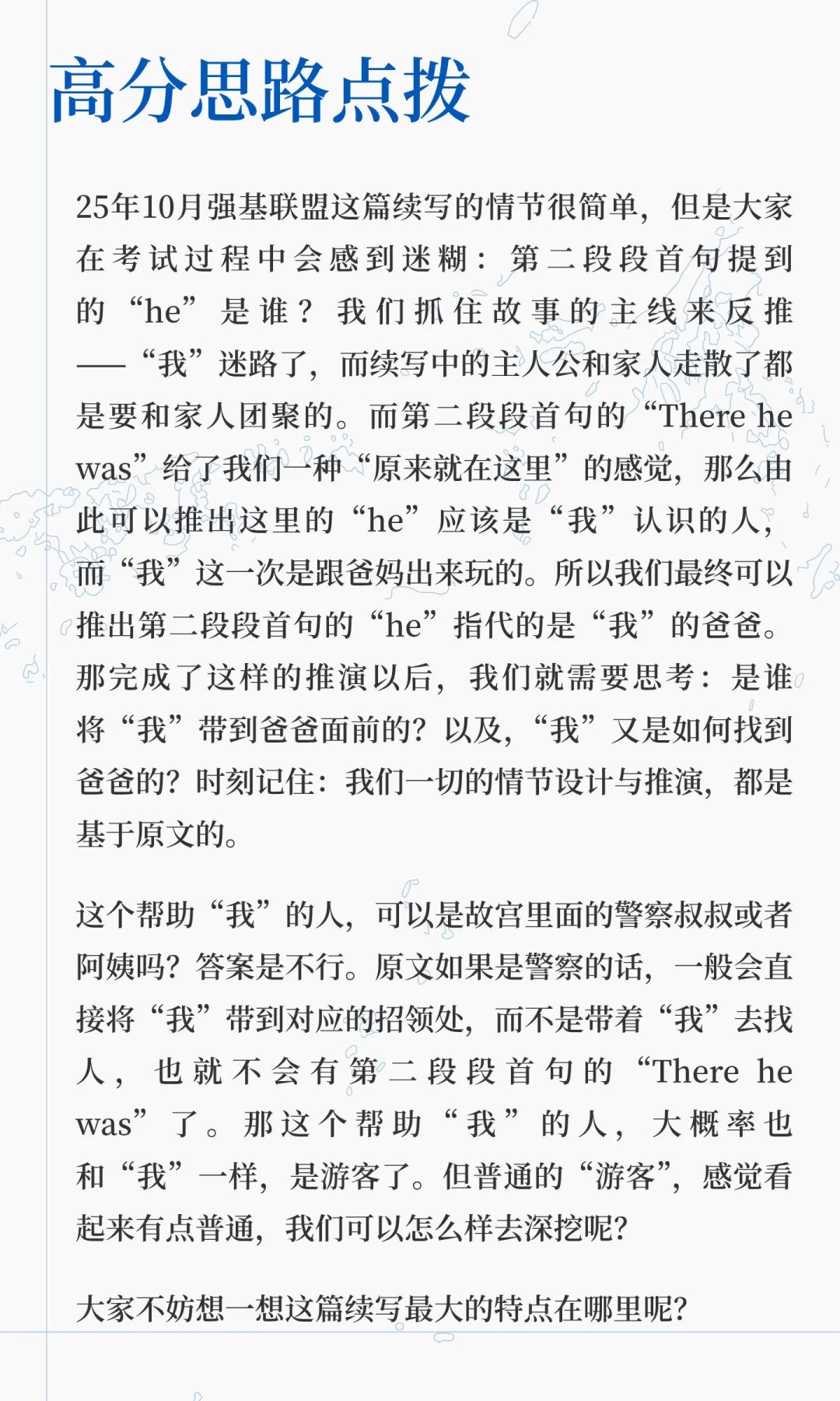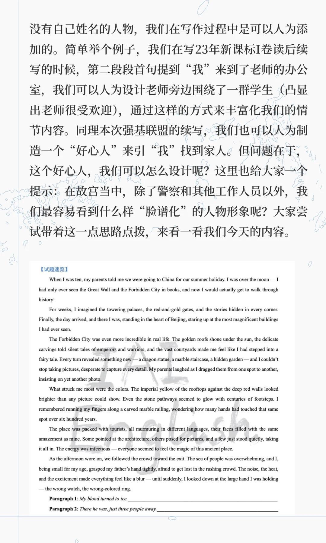 简单举个例子,我们在写23年新课标I卷读后续写的时候,第二段段首句提到“我”来到了老师的办公室,我们可以人为设计老师旁边围绕了一群学生(凸显出老师很受欢迎),通过这样的方式来丰富化我们的情节内容。同理本次强基联盟的续写,我们也可以人为制造一个“好心人”来引“我”找到家人。但问题在于,这个好心人,我们可以怎么设计呢?这里也给大家一个提示:在故宫当中,除了警察和其他工作人员以外,我们最容易看到什么样“脸谱化”的人物形象呢?大家尝试带着这一点思路点拨,来看一看我们今天的内容。