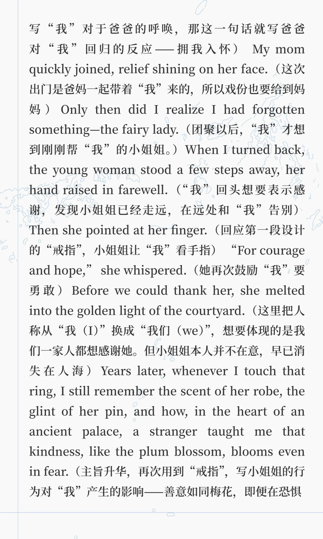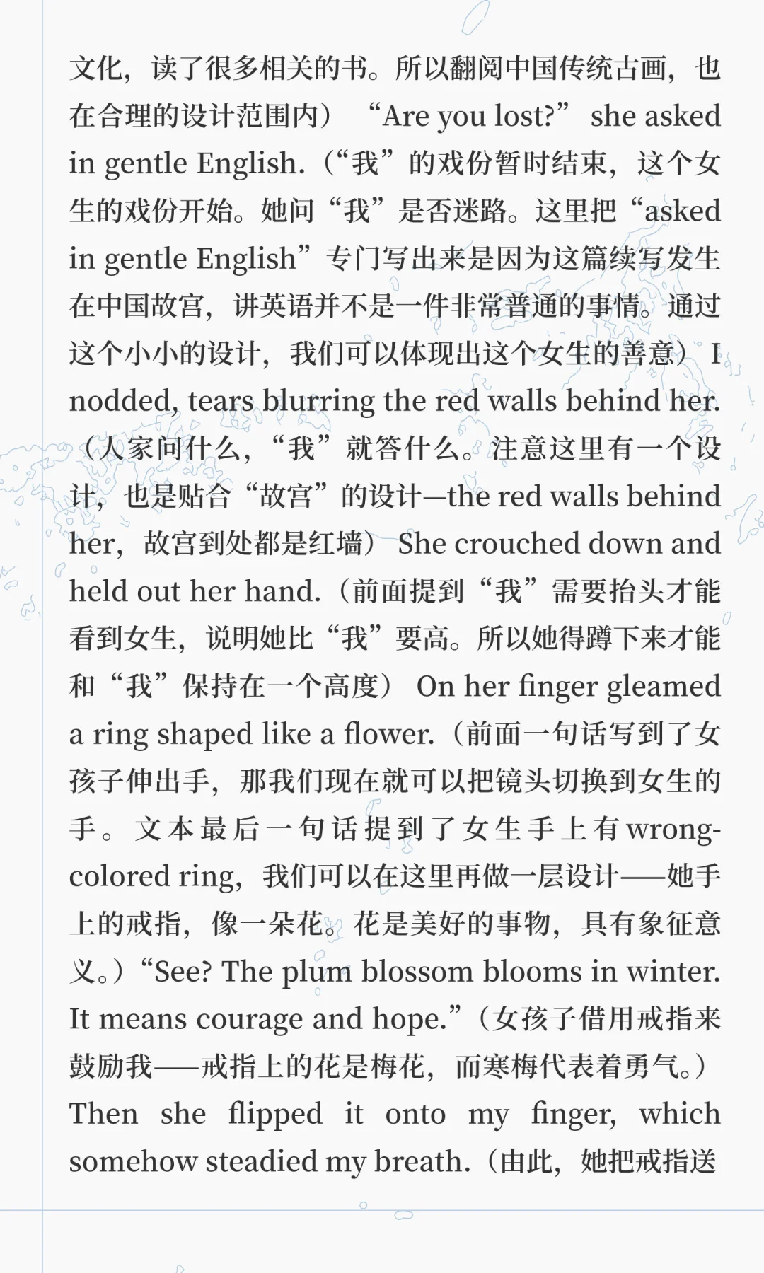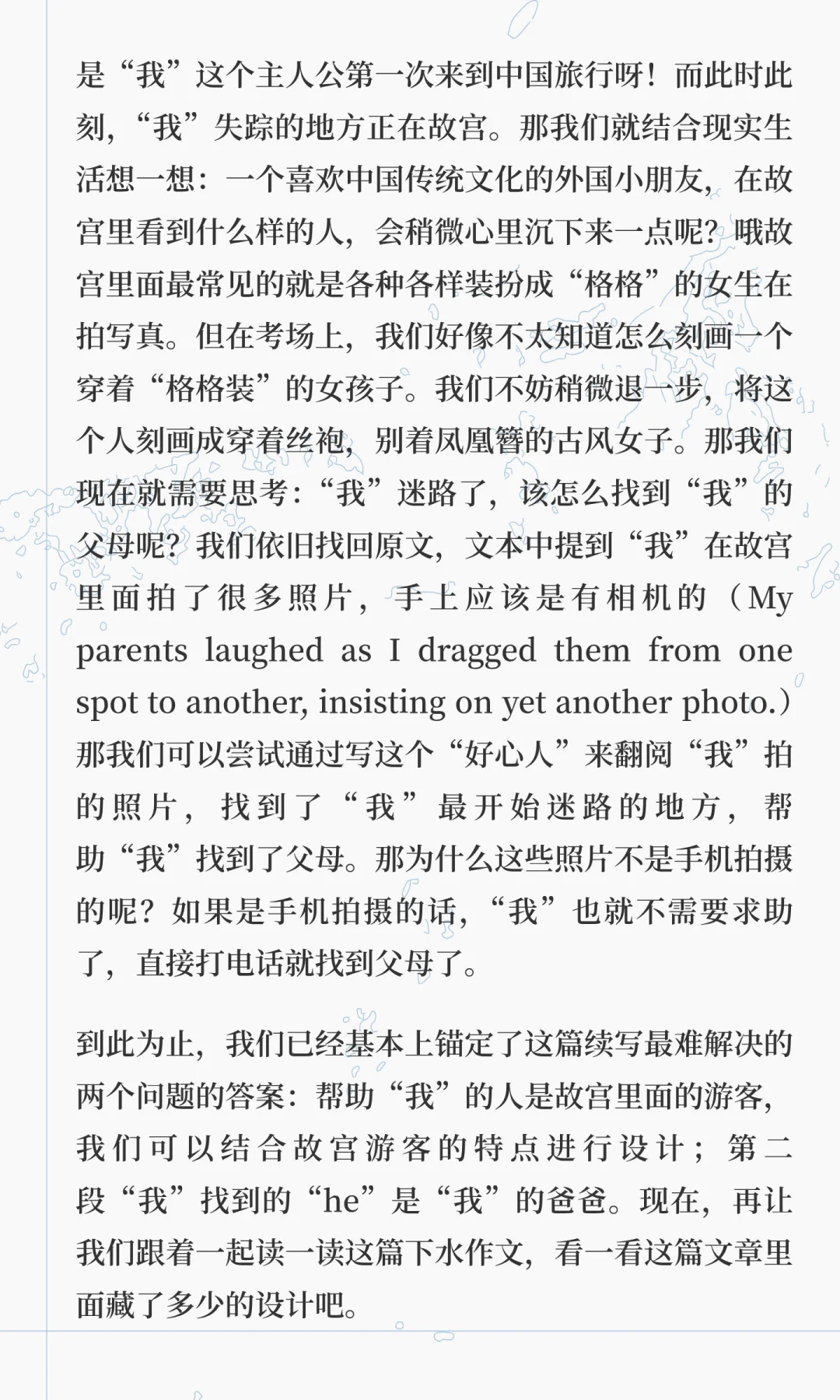 很多朋友(包括教师朋友在内)在学习读后续写的过程中,一定听过这么一句话:读后续写是绝对不能添加人物的。其实在写作的过程中,没有绝对的说法。今天我们要给大家分享的这篇续写就是一个很典型的例子:这篇续写讲了一个外国小朋友在中国故宫游览的过程中与父母失散的故事,而我们如果不在写作过程中添加一个“好心人”来帮助这个小朋友找到家人,这篇续写的情节都无法推进下去了。