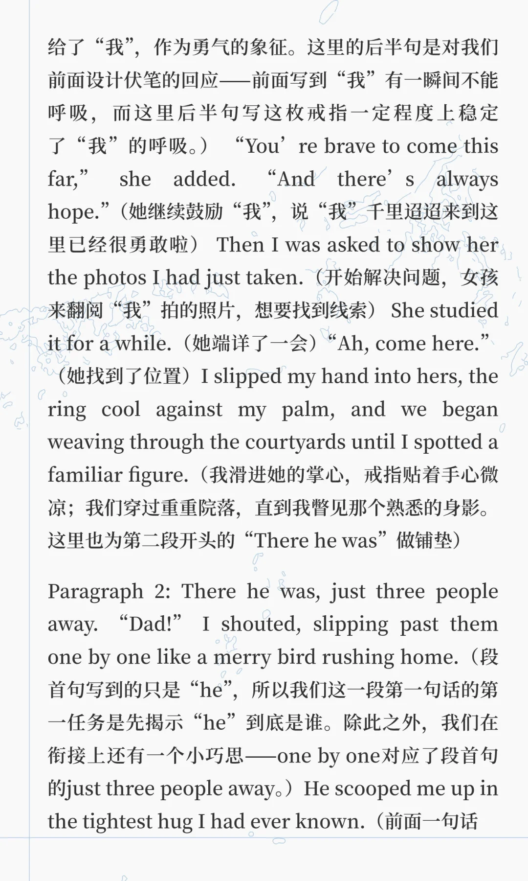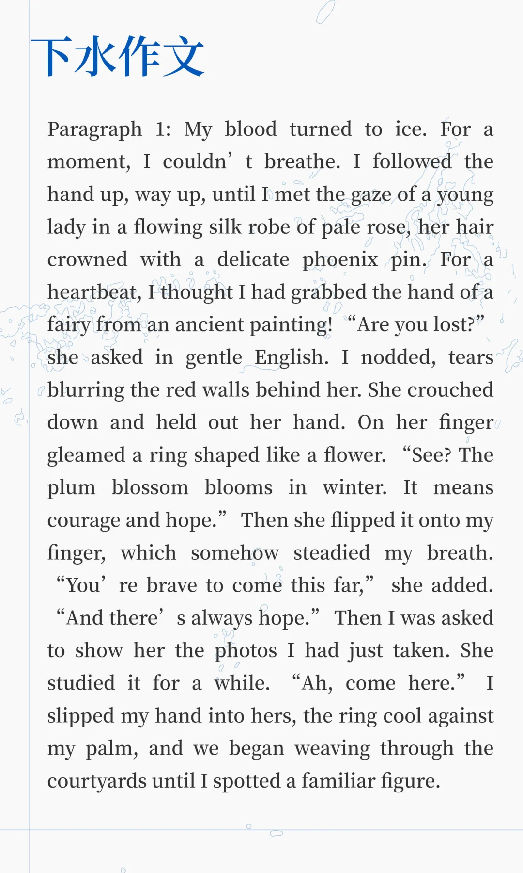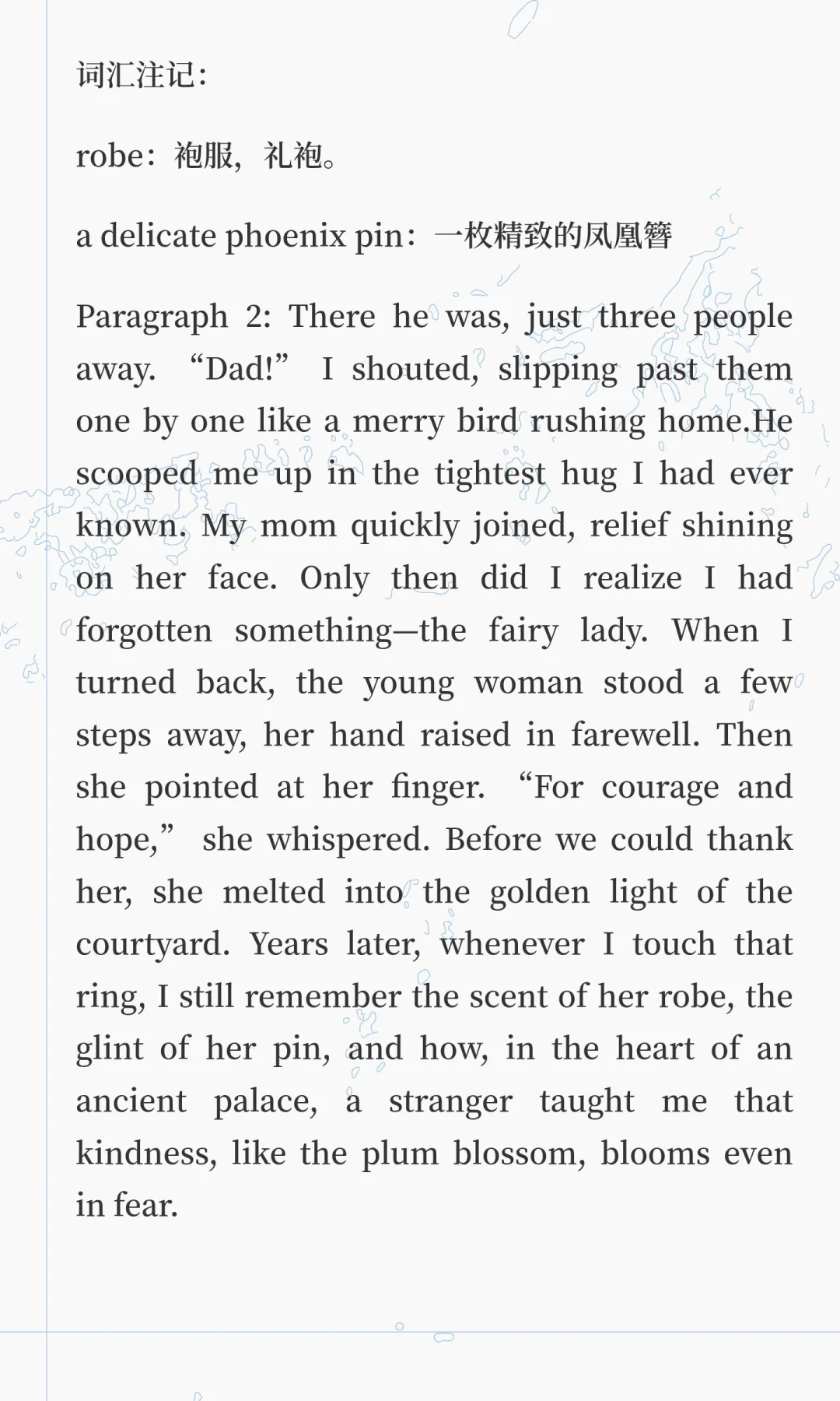 很多朋友(包括教师朋友在内)在学习读后续写的过程中,一定听过这么一句话:读后续写是绝对不能添加人物的。其实在写作的过程中,没有绝对的说法。今天我们要给大家分享的这篇续写就是一个很典型的例子:这篇续写讲了一个外国小朋友在中国故宫游览的过程中与父母失散的故事,而我们如果不在写作过程中添加一个“好心人”来帮助这个小朋友找到家人,这篇续写的情节都无法推进下去了。