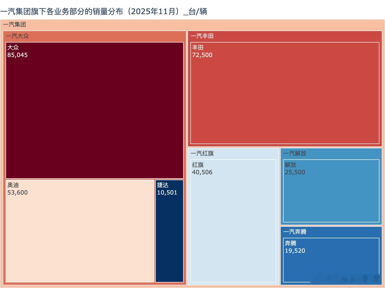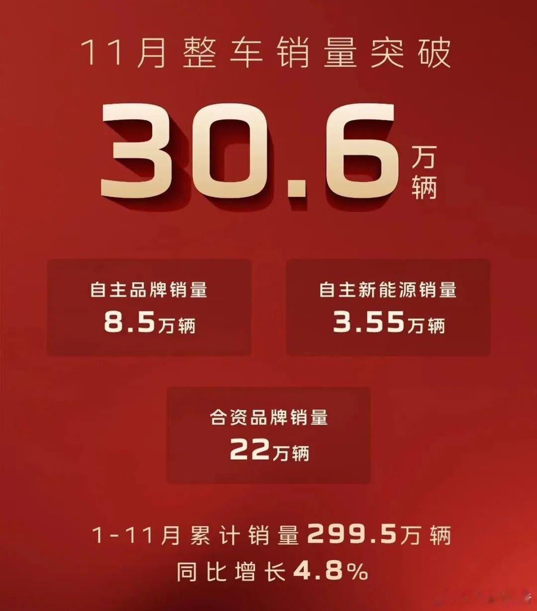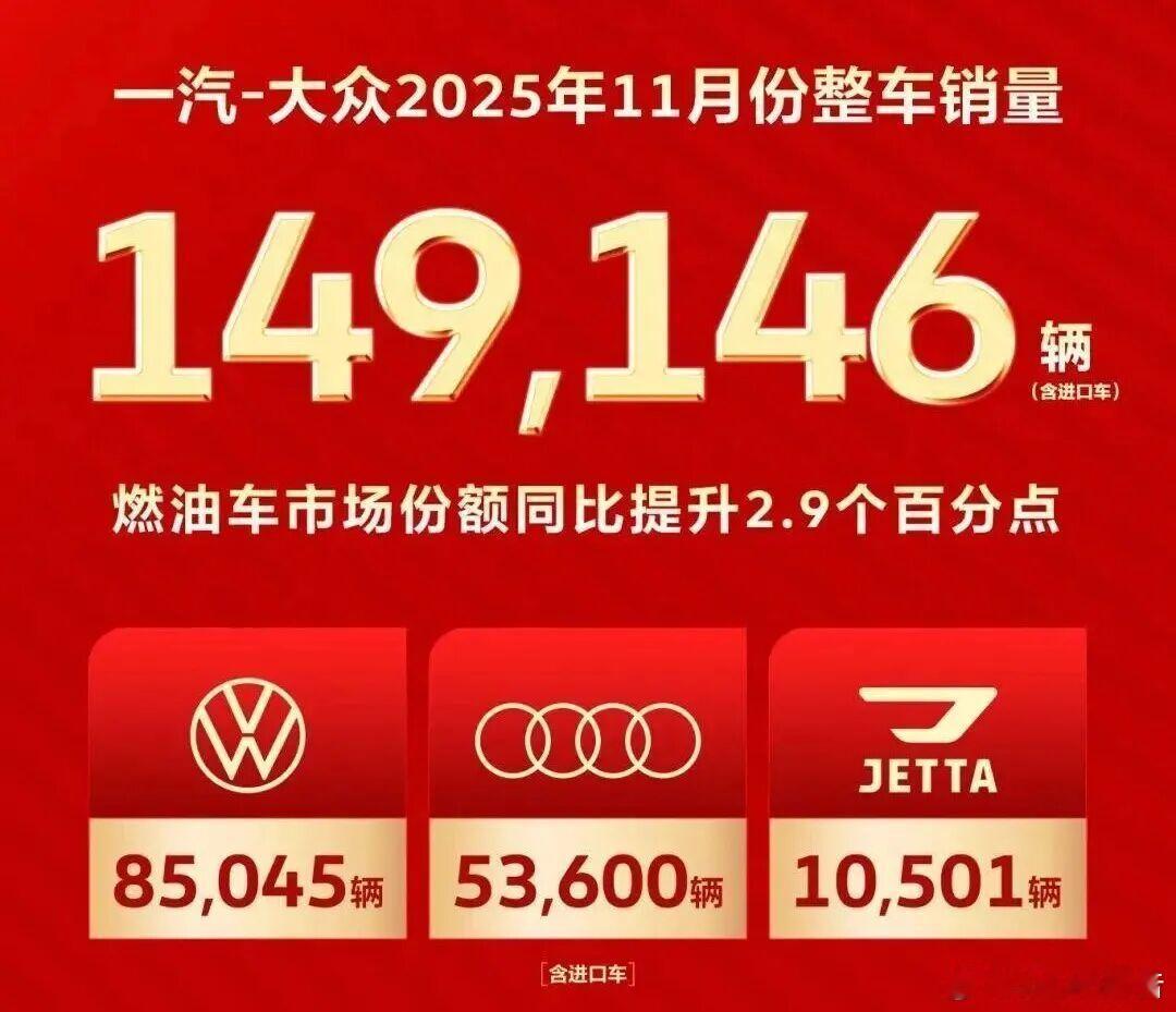 一汽集团11月销量30.6万辆一汽集团公告11月份实现总销量:30.6万台,其中8.5万台自主品牌(含3.55万台自主新能源)、22万台合资品牌整车。汽场全开一汽集团一汽-大众11月销量149146辆一汽红旗