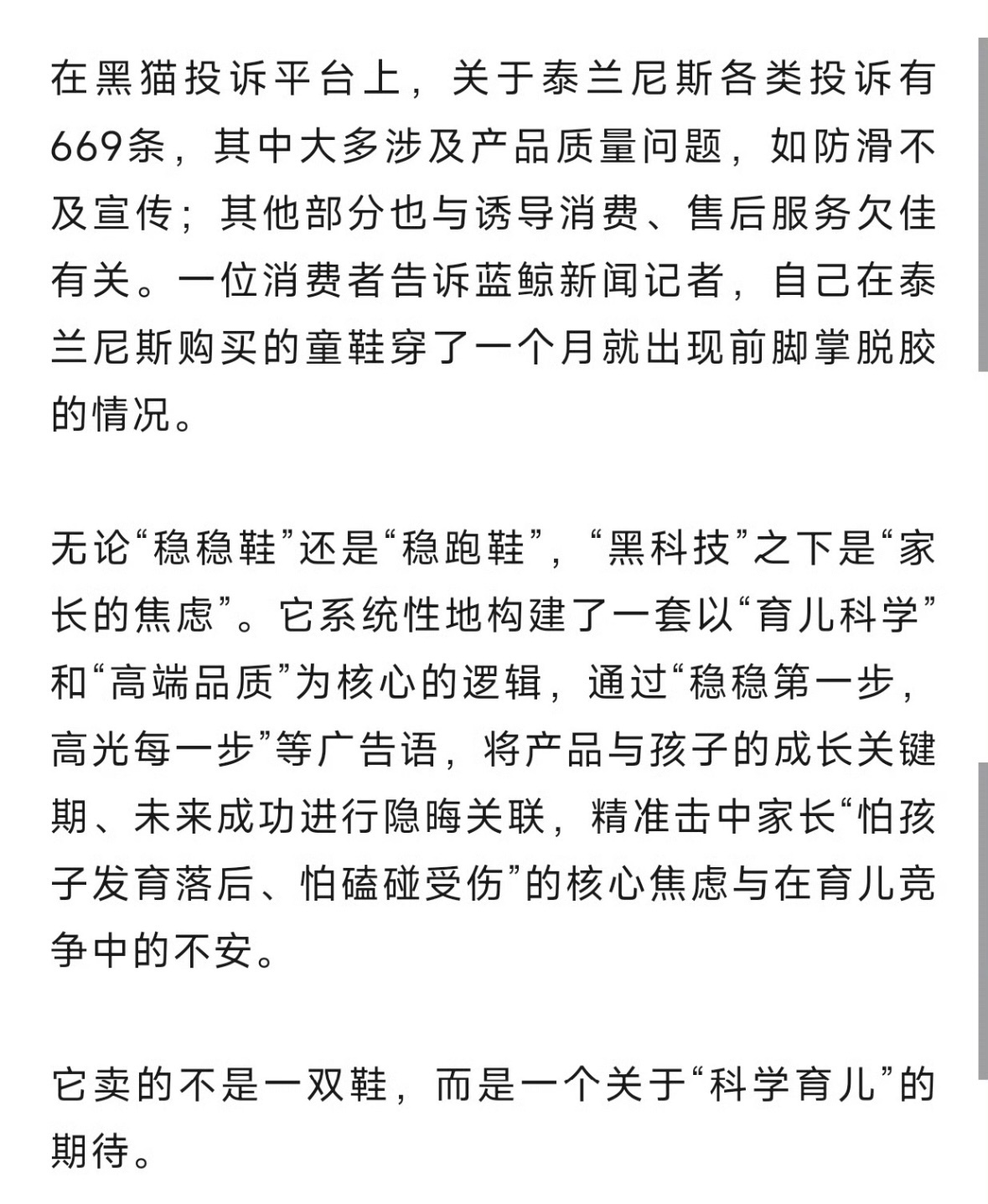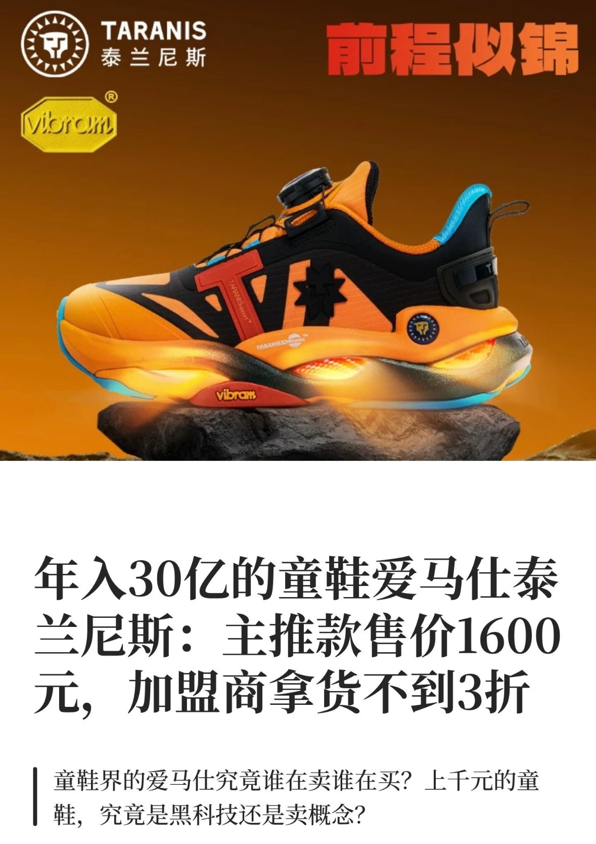 1600元泰兰尼斯童鞋拿货价不到3折代理拿货价3折这个并不奇怪,代理的成本也高,你光代理费和门店费用就得花多少进去了。我们家孩子之前一直穿这个品牌,因为一件小事彻底脱粉。它的定价越来越贵,基本没什么折扣,花了700左右买了一双跑步鞋,不到一个礼拜脱胶。到了门店反应质量有问题,也不给解决,导购说要汇报,给到的解决方法是返场维修。大概半个月后拿回来了,穿了几天原地方又脱胶了,干脆直接扔掉了。价格完全匹配上相应的质量,说实话有点失望。稳跑鞋算是他们家的王牌单品,卖点很精准,宝宝学走路的第一双鞋。定价也挺高,1600多块,专利大都是外观专利,实用新型有效专利就两项。稳跑鞋采用碳板材料做的,骨科专家不建议儿童穿这类鞋。不过电梯广告打的挺狠的,效果也是立竿见影,童鞋中的爱马仕这个标签倒是有了。分析:【1600元泰兰尼斯童鞋拿货价不到3折】泰兰尼斯加盟只选核心商场最好位置从火车站机场到电梯电