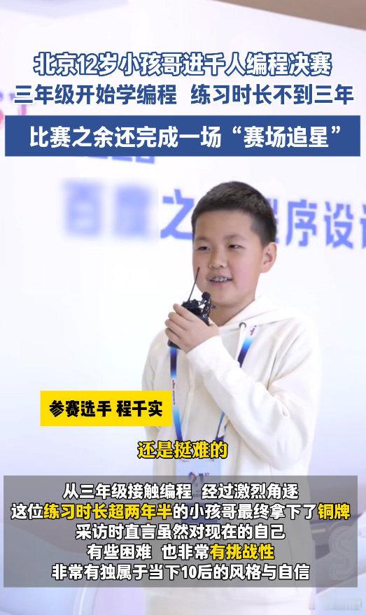 北京12岁小孩哥进千人编程决赛清北赛场惊现12岁“黑马”!程千实用代码打破年龄壁垒,拿铜牌的样子太酷了!北京小孩哥混入清北赛场
