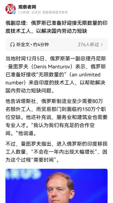 印度赢麻了,俄罗斯决定向印度引进大量的印度劳工,印度不费一枪,正在殖民全球,这就是人口多的优势呀! 印度人废了美国,废了加拿大,废了新加坡,接着去废俄罗斯,俄罗斯没有被乌克兰北约拿下,却要很快被阿三征服了! 一个想捡现成的,一个想把你当耗材,看谁能算计过谁吧。印度人在欧美发迹的诀窍:先声称被歧视索要更多权利,成立专门社区均由印度人管理,然后抱团争取选票。这套流程在毛子那里不知道好不好使。 不过,俄罗斯最需要劳动力的地方是西伯利亚,不知道印度人能够适应严寒气候不?阿三都穿拖鞋的,大鹅给准备棉鞋吗?