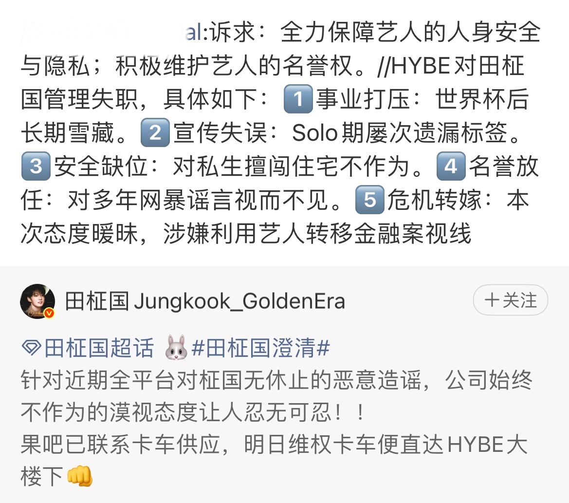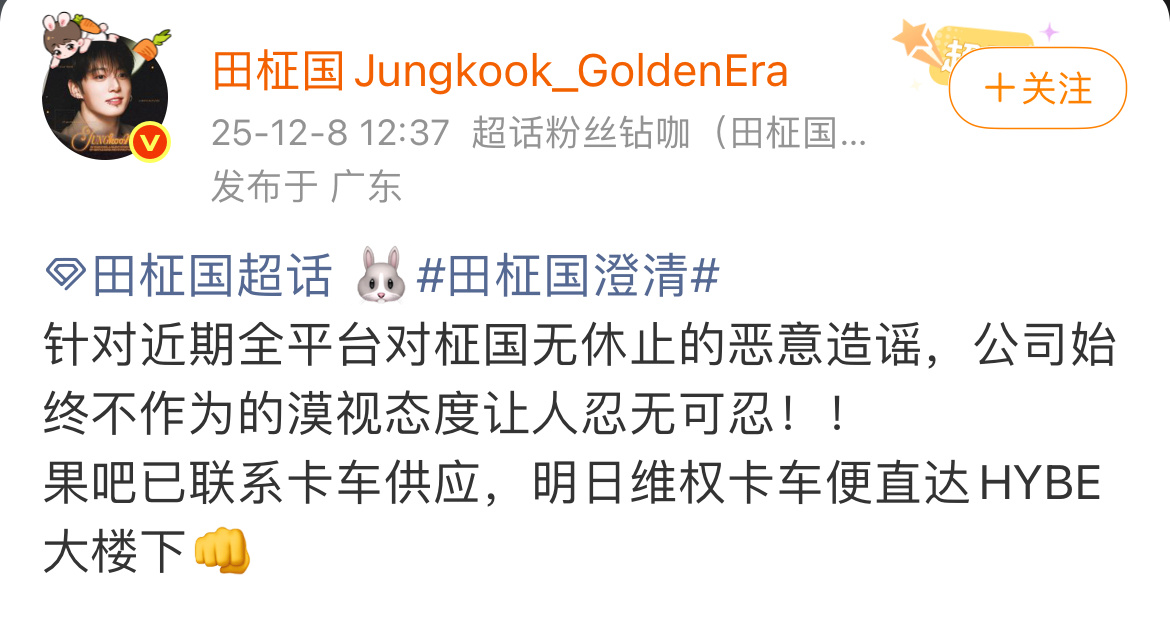 田柾国大吧发文 后续:田柾国粉丝准备开卡车🚚维 权,明日抵达hybe楼下