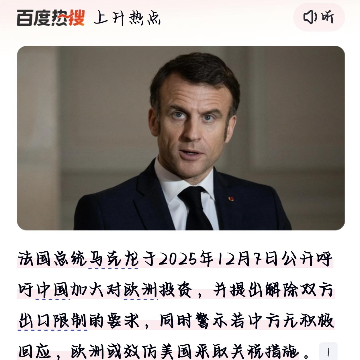 马克龙近期多次喊话中国“投资欧洲救工业”,看似是经济合作呼吁,实则藏着精打细算的算计。中国制造业升级后,欧洲部分产业确实面临竞争压力,但马克龙选择性忽视了欧洲自身的问题:能源成本高企、产业政策滞后、创新动力不足,这些才是工业困境的主因。反观中国,从空客到核电站,欧洲企业在中国市场赚得盆满钵满,还长期占据服务贸易顺差。 更讽刺的是,欧盟一边要求中国“技术转移”,一边对中国电动车加征45%关税,还冻结《中欧投资协定》。这种“既要吃中国饭,又要砸中国锅”的操作,本质上是在用保护主义掩盖竞争力衰退。中国对欧投资集中在新能源、基建等绿色领域,反倒帮助欧洲搞产业转型,而欧洲却用“国家安全”为由限制中国高科技企业,双标玩得飞起。 说到底,中欧经贸本是互补共赢——中国提供市场和技术落地空间,欧洲输出高端制造经验。但马克龙们若总抱着“我吃亏论”搞胁迫,把经贸问题政治化,最终只会两败俱伤。毕竟,没有企业愿意在筑墙筑垒的市场里投资,更没人会一直当“慈善家”。法国马克龙 马克龙 中法经济合作 法国欧洲战略 中法技术合作