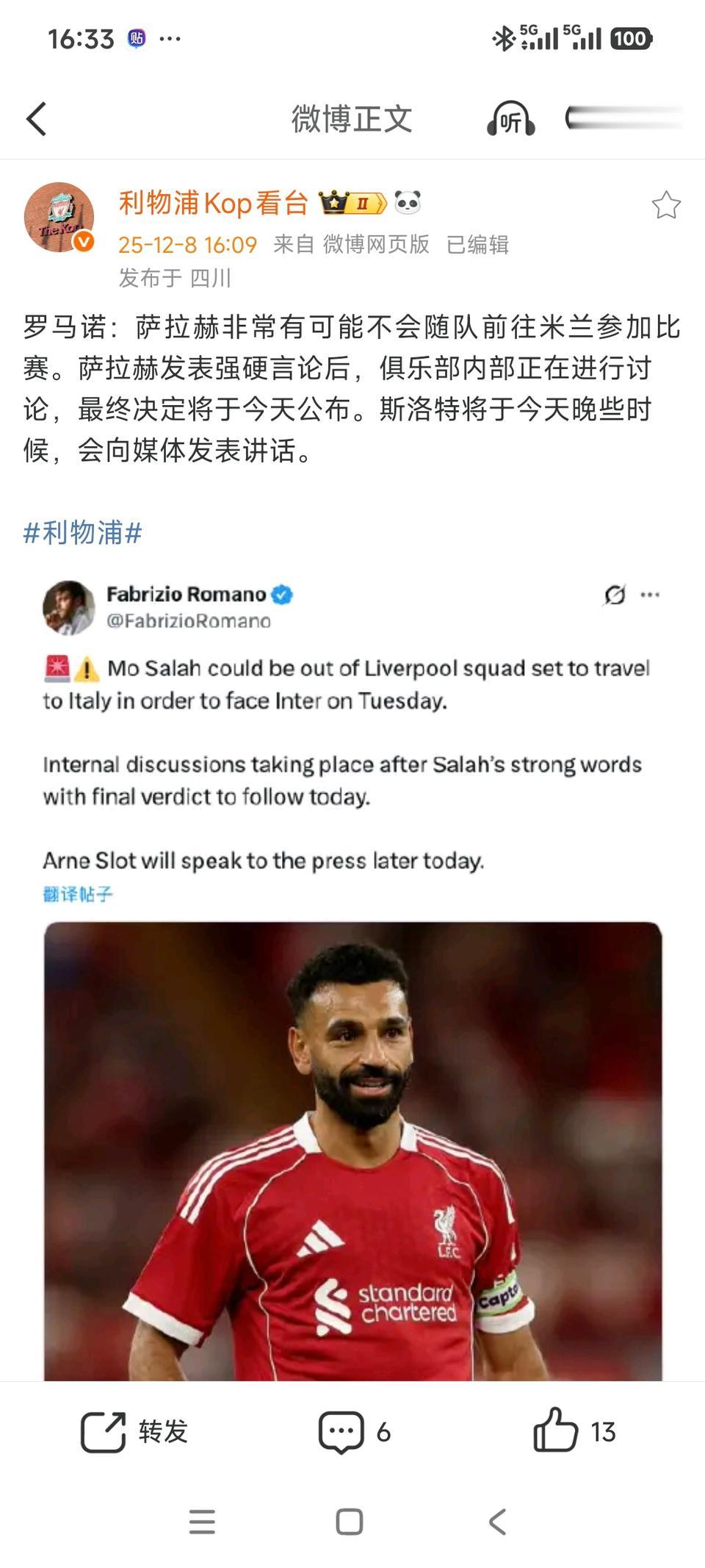 利物浦与萨拉赫分道扬镳!根据每日电讯报的消息,利物浦主帅斯洛特和管理层开会,商量 【3评论】【1点赞】 穆罕默德·萨拉赫 利物浦 斯洛特 每日电讯报 国际当红足球明星 英超 生活精彩片段 2025-12-07