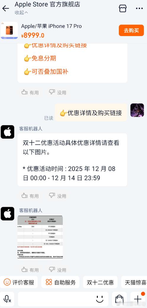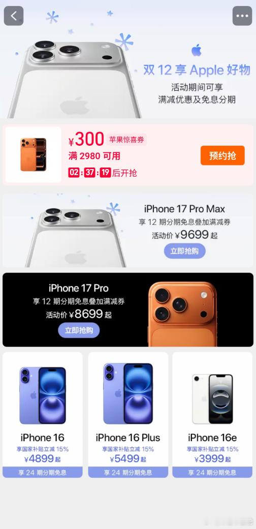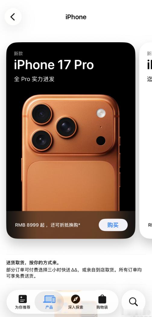 【】 12月8日,苹果 iPhone 17 Pro / Pro Max 手机现已在 Apple Store 官方旗舰店渠道破发,两款机型均限时直降 300 元,其中原价 8999 元起的 iPhone 17 Pro 现到手价 8699 元起,而原价 9999 元起的 iPhone 17 Pro Max 也有相同优惠,到手价 9699 元起。 疑似某购物平台暗广,我在官方Apple Store找了半天也没找到降价300的消息。原来要到你们那领券啊…