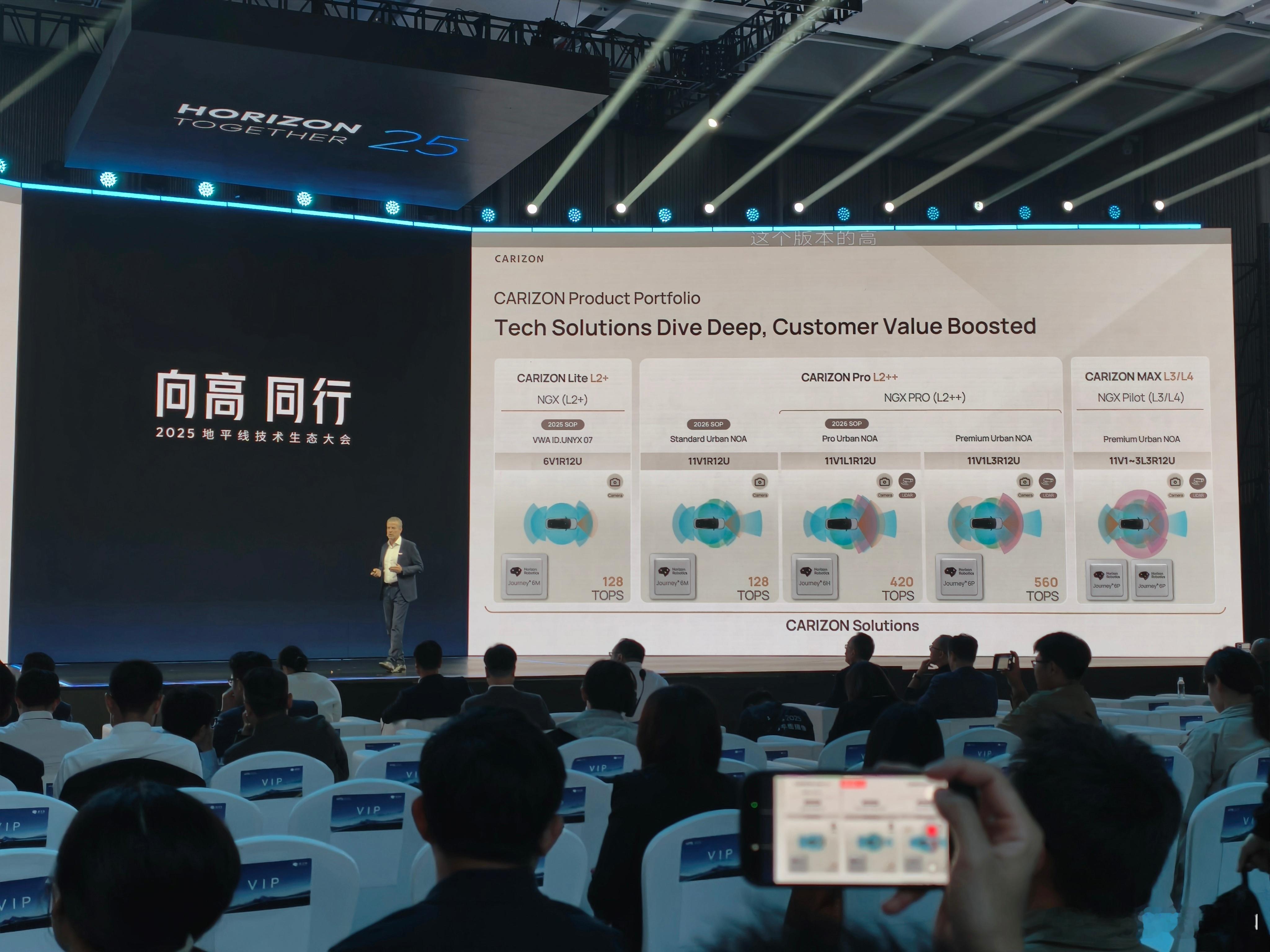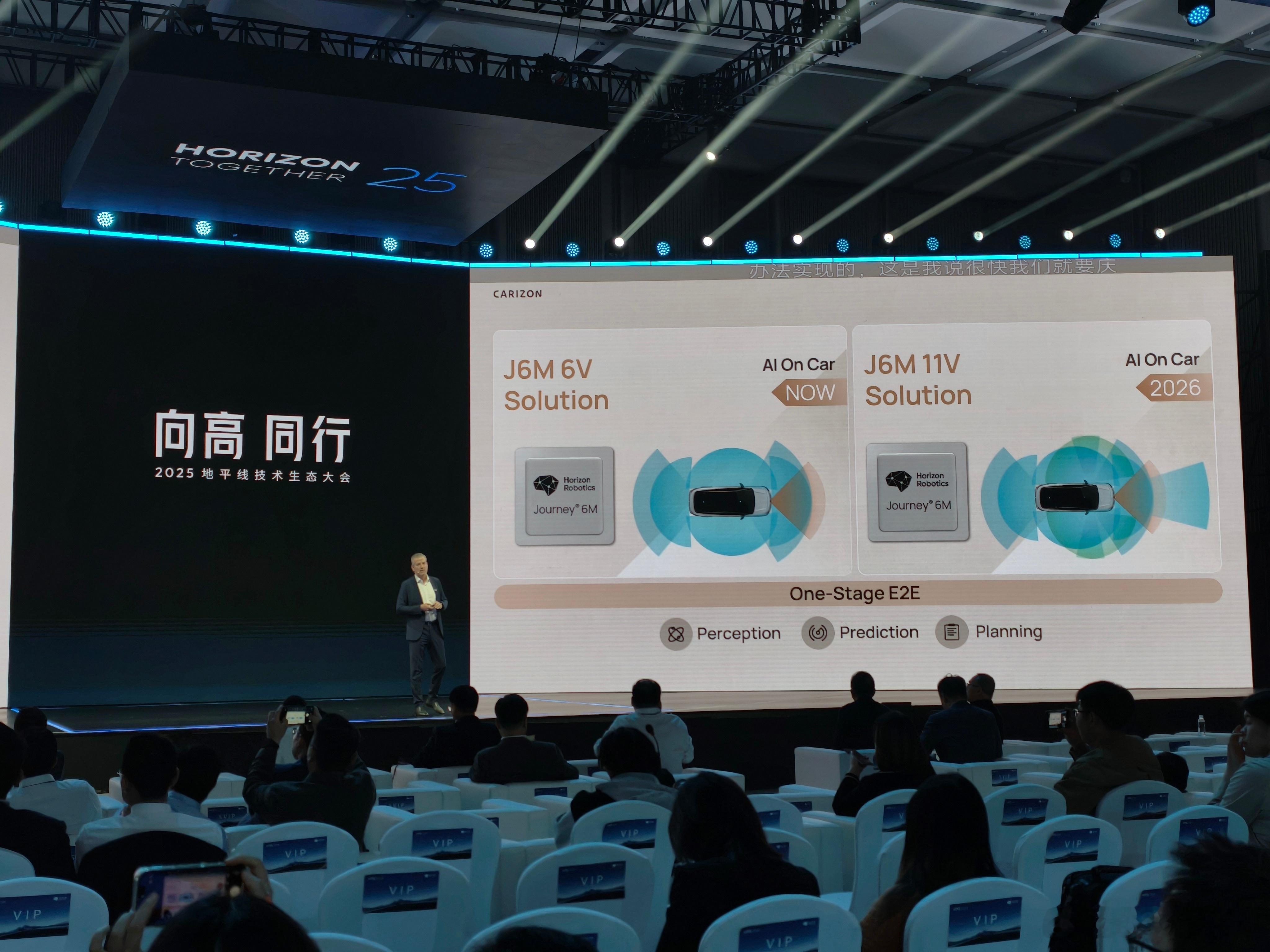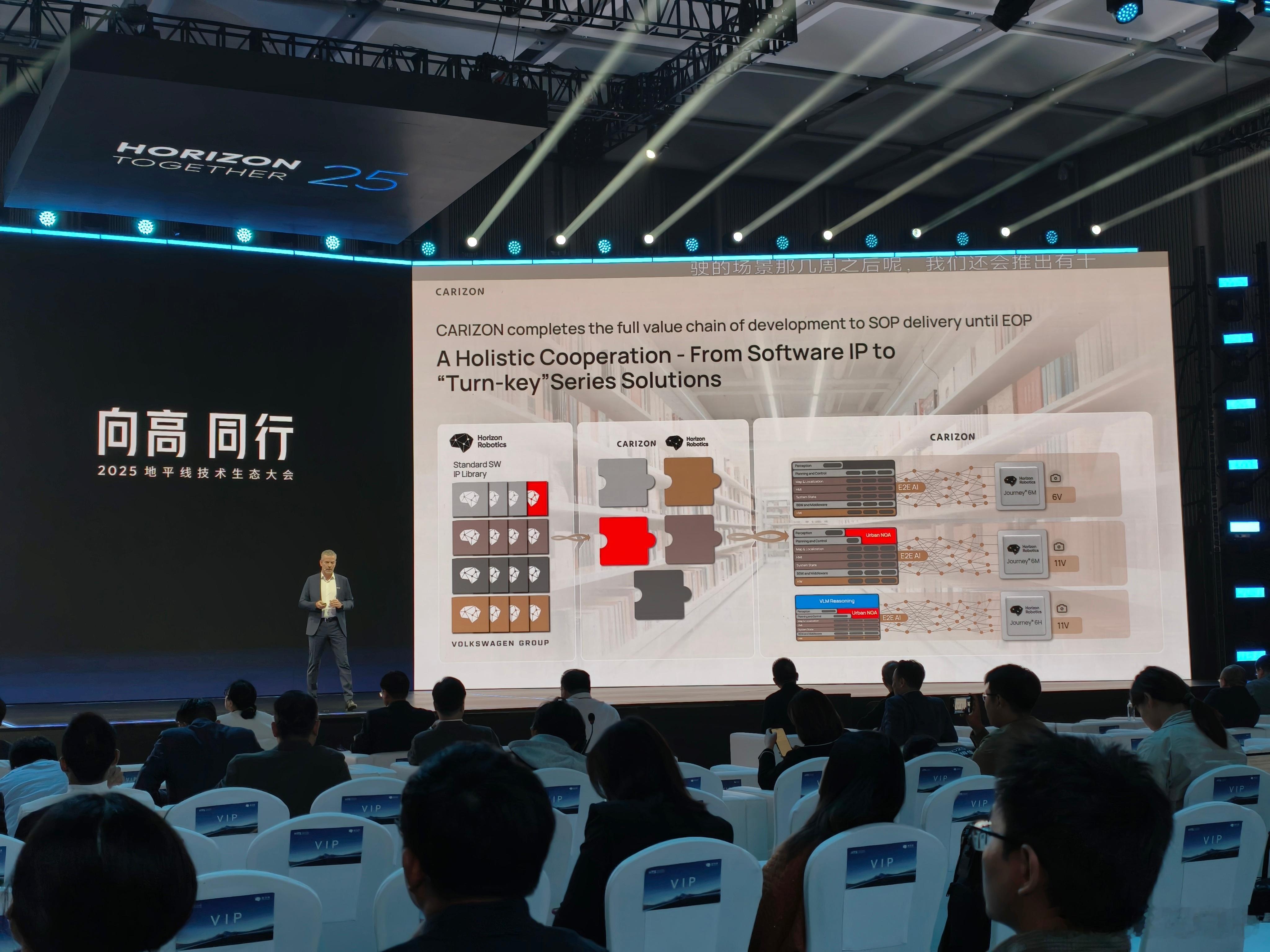 记录一下,大众酷睿程基于地平线芯片的几个方案。目前已经有的是基于与众 07 的单 J6M 方案,能实现基础的 L2+ 功能。后续会有基于单 J6M 的城区 NOA 方案,也会有基于单 J6P 的 Pro 版城区方案,还会有基于双 J6P 的,面向 L3/L4 的方案。现场还展示了基于小鹏 G6 改装的方案2025地平线技术生态大会