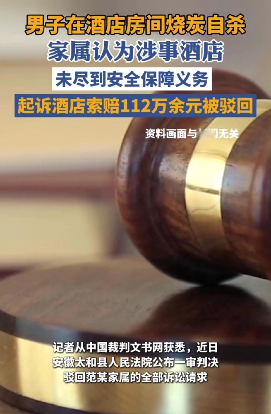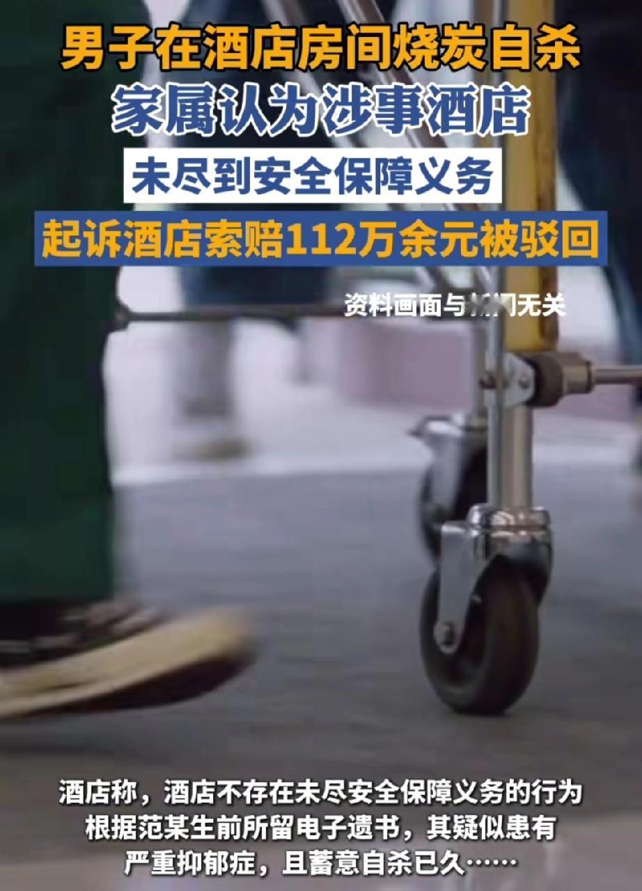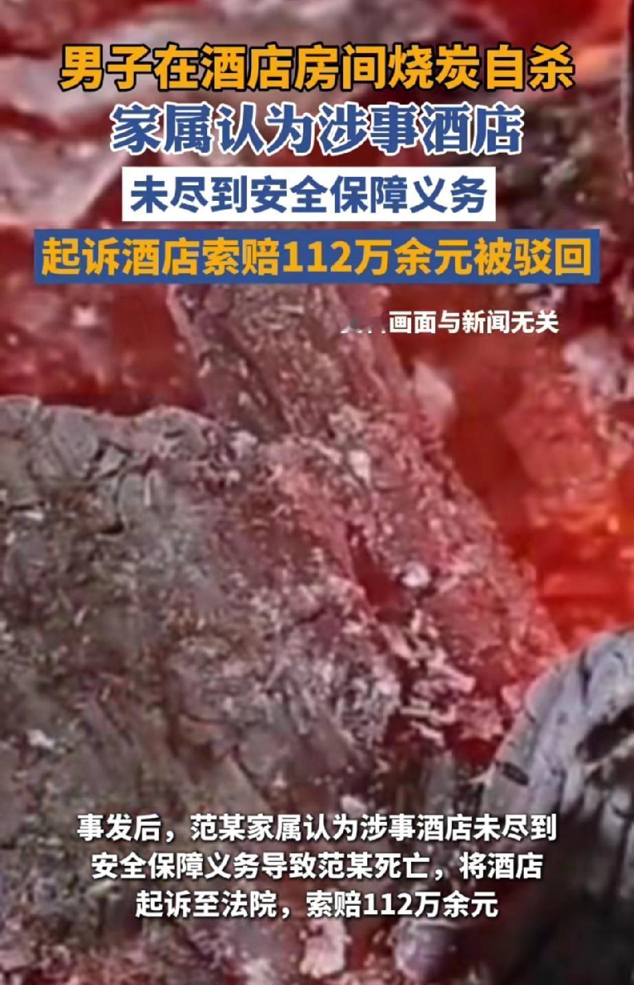 男子入住酒店后烧炭自杀,家属以酒店未尽安全保障义务为由,起诉索赔112万元。 近