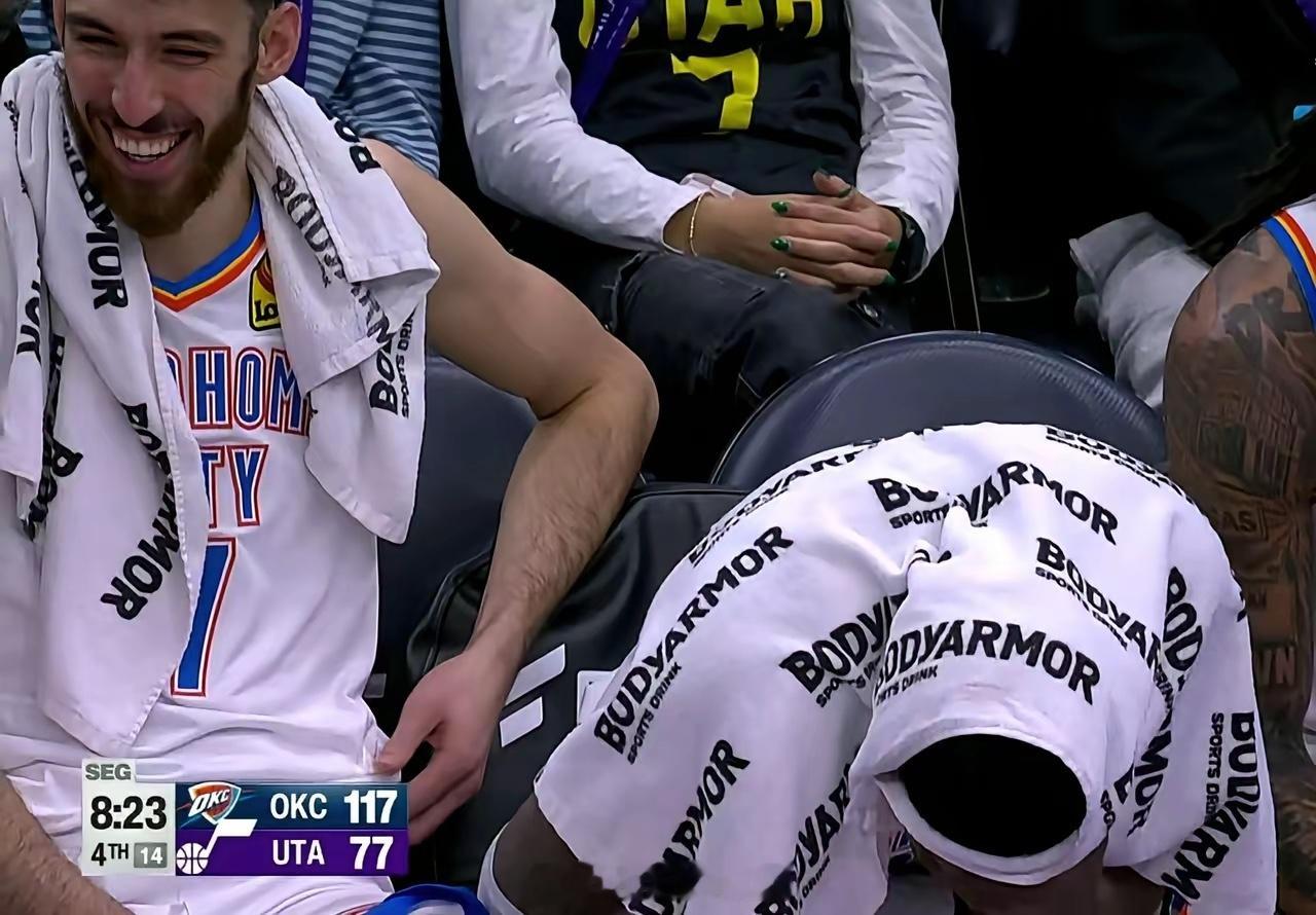 说实话:这就是联盟断档的存在!15连胜!sga等几位主力战术性轮休,二当家杰伦威廉姆斯和三当家切特霍姆格伦三节又打卡下班了!看看雷霆替补席人仰马翻,无比开心的样子,俩人就打了20几分钟就休息了,无比的轻松,就想问问联盟有哪支球队能不羡慕雷霆的替补阵容实力,在雷霆客场挑战爵士的比赛中,实际上第一节就打崩了爵士领先25分,到了末节主力都不打了,替补上来继续打崩对手,最高领先42分,戴格诺特现在也是无比的轻松惬意,自己的球队兵强马壮,即使替补打战斗力也是不俗的,可以按计划可以不间断的轮休主力,也不影响球队的战绩,还手握一推选秀权,真的是良性循环啊!