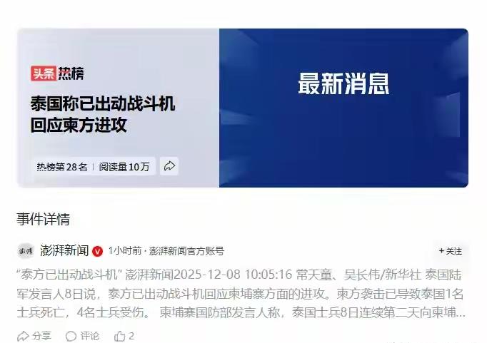 泰国和柬埔寨爆发激烈战斗,一名泰国少校在战斗中被炸身亡。随后,泰国出动F16战斗机对柬埔寨展开轰炸。 当下,俄罗斯和柬埔寨均处于战争状态,大家前往这两地旅游务必注意安全。 ……………………………………