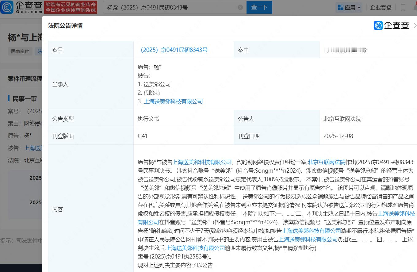 【杨紫维权进展】杨紫申请强制执行 企查查APP显示,近日,法院刊登与上海送美邻科技有限公司网络侵权责任纠纷一案民事判决书。判决书显示,被告送美邻公司在其运营的视频账号中使用了杨紫的肖像照片和姓名,构成对杨紫肖像权和姓名权的侵害,法院判定被告公司公开向杨紫道歉。判决生效后,被告公司逾期未履行致歉义务,杨紫申请强制执行。