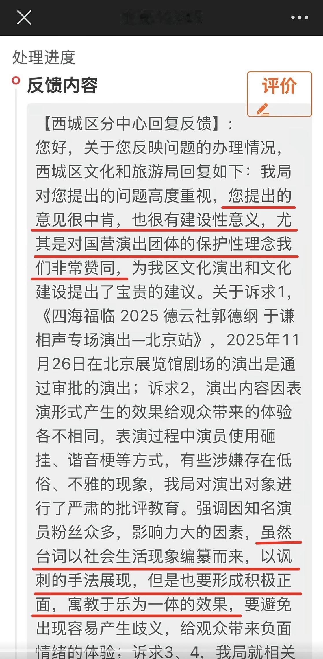 郭德纲因为一段讲同行的相声被举报,原本只在粉丝中间传播的段子,因为西城文旅的批评教育,反倒把整个逻辑瞬间打通一夜出圈,主流相声团体原本可以不接这个话茬,偏偏有人气不过跑去12345平台投诉,怕什么来什么,西城文旅这一约谈相当于替主流团体接了棒,到此为止成了刚刚开始。约谈也罢,在回复中的文字一句“要寓教于乐”还把群众基础都给说没了,是真不懂普通人想要什么。