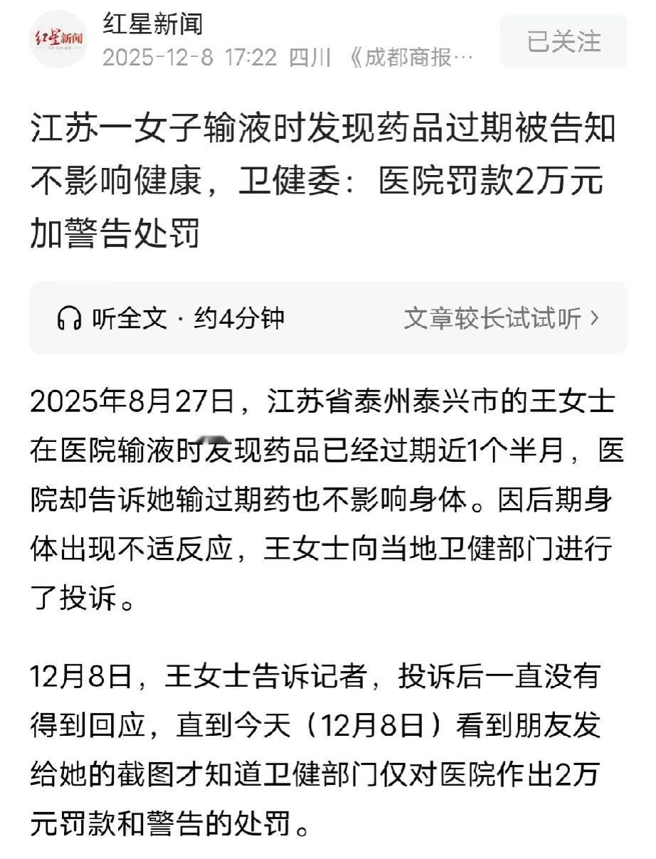 江苏泰州,女子肺炎去输液,吊针时她意外发现,注射液已过期45天,女子告知护士后,护士赶紧处理掉输液袋,之后院方表示,输了过期药水,对身体没有任何影响,没想到,次日女子就出现了发热、胸闷等症状,可院方却以女子心里压力大、饮食不佳等理由推托,提都不提药水过期的事。女子气不过,投诉到卫健委,结局让她始料不及。 8月20号左右,王女士就断断续续感冒咳嗽,她自己买了药,又到诊所看医生,但是一直没断根,还是咳。 王女士不放心,决定到当地某医院去认真查查,她怀疑之前自己没有对症下药,所以病情才一直拖着。 8月27号那天,王女士在某医院查出了患有肺炎,医生告诉她咳得太久了,估计得输液一周左右。 王女士没办法,一周就一周吧,只有病好、身体好了,才能安心工作。 当天医生给她开了几瓶药水打吊针,王女士平时是一个心细的人,对什么事都观察得挺到位。 就在医生给她输液的时候,王女士发现,那瓶药水它的生产日期写:2023年7月14日,保质期到2025年7月13日。 王女士以为自己看错了,赶紧站起来仔细查看,当她凑近瓶子一看,果然没错,那瓶药水已经过期45天了。 更让王女士着急的是,那瓶药水正源源不断输入她的血管里,而且已经输入一大半了。 王女士慌了,赶紧叫来护士,护士过来发现药水过期后,默不作声,赶紧拔了针头拿走那瓶过期的药水。 等王女士家属跟过去,想要留下凭证的时候,护士已经把药水处理掉了。 事后,王女士找到医院负责人,希望他们给自己一个说法,可院方却表示,即使是输入过期的药水对身体也没有任何影响。 对此,王女士半信半疑,可自己又拿他们没办法,只好悻悻离去。 谁料,28号开始王女士就出现发热、胸闷、心悸等症状。 她怀疑是输入过期药水引起的,她找到医院沟通,对方还是说跟过期药水无关,可能是王女士心里压力过大或者是跟饮食不当导致。 对此,王女士不理解也没法接受,在朋友的建议下,她把这个事投诉到卫健委。 泰州政府的“信用泰州”平台在12月3日发布了正式处理结果,是针对王女士投诉的这件事。 泰兴市卫健委确认了泰兴市某医院在2025年8月27日,给王女士用了过期的注射液,这是违法的事实。 最后卫健委按照《医疗纠纷预防和处理条例》的规定,对该医院做出了两项处罚:一是罚款2万元,二是给予警告处分。 根据《医疗纠纷预防和处理条例》第47条规定,医疗机构及其医务人员有“违反药品、医疗器械等临床应用管理规定”情形的,由卫生主管部门责令改正,给予警告,并处1万元以上10万元以下罚款。 本案中,该医院使用过期的注射液,属于违反药品临床应用管理规定的行为,卫健委据此对其作出警告并罚款2万元的处罚,罚款金额在法条规定的1万至10万元区间内,处罚决定完全符合该条款的要求。 不过,王女士在投诉后,并没有收到反馈,直到她跟朋友提起,朋友给她看了处理结果的截图,她才知道12月3号,该医院就已经受到了处罚。 王女士认为即使医院受到了处罚,过后还应该给自己一个说法,甚至给自己一定的补偿。 对此,医院负责人表示,他们医院的相关科室有报备过此事,但王女士过后又投诉到卫健委,他们不知道该怎么做,所以就不了了之了。 对此,有网友说,看完这事真觉得太气人了,医院的操作实在说不过去。 他认为医院先用了过期药,还当场销毁证据,后续又甩锅患者心理压力、饮食问题,连句道歉都没有,这态度根本没有认错的诚意。 而且卫健委已经认定医院违法并处罚了,就说明医院确实有错,既然错了就该主动找王女士道歉,还得根据她出现的不适症状进行合理赔偿。 不少网友还觉得2万元罚款太轻,医院没吃到教训,只有道歉加赔偿,才能让患者得到应有的交代。 那么,王女士有权要求医院赔偿吗? 依据《民法典》第1223条规定,因药品、消毒产品、医疗器械的缺陷,或者输入不合格的血液造成患者损害的,患者可以向医疗机构请求赔偿。 本案中,医院使用的过期注射液属于不合格药品(劣药),符合“药品缺陷”情形。 王女士输液后次日即出现发热、胸闷等不适,损害结果与使用缺陷药品存在合理因果关联,且卫健委已认定医院使用过期药的违法事实。 医院不仅未妥善封存证据,还拒绝承担责任,王女士完全有权依据该法条要求医院赔偿医疗费、误工费等相关损失。 另外,《民法典》第1219条规定,医务人员在诊疗活动中应向患者说明病情和医疗措施,未尽到说明义务造成患者损害的,医疗机构应承担赔偿责任。 本案中,医院使用过期注射液却未提前告知王女士药品情况及潜在风险,违反了法定说明义务。 王女士输液后出现发热、胸闷等不适,且医院存在销毁证据、推诿责任的行为,进一步加重了其权益损害。 医院未尽到充分告知义务与王女士的损害存在关联,王女士可依据该条款主张医院承担相应赔偿责任。 对此,大家怎么看?