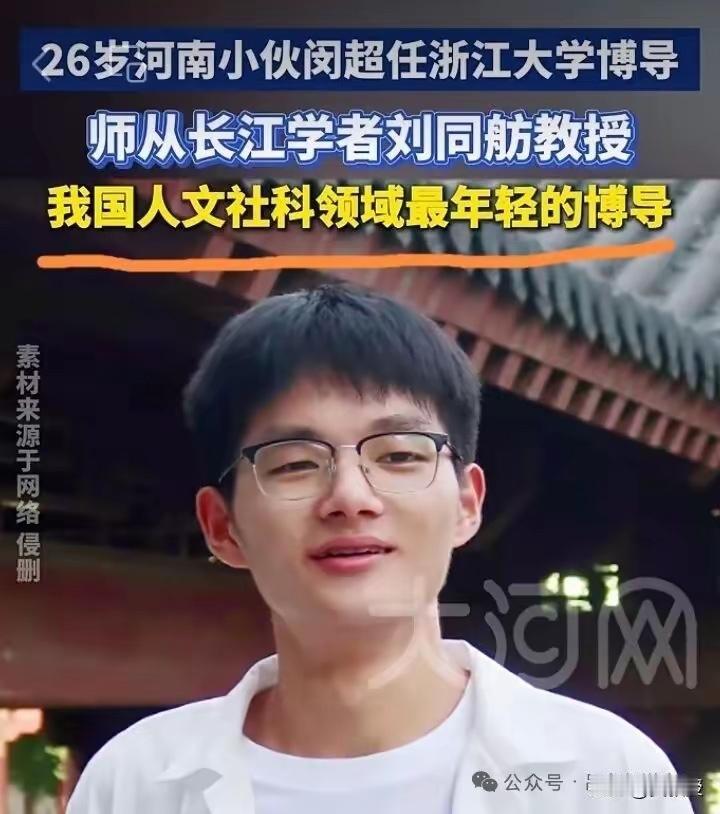 浙大马院:出了个26岁的博导! 是的,没有看错!中国顶尖985浙江大学出了一个奇才:26岁的博士生导师,惊为天人啊! 通常情况下,18岁高中毕业、22岁本科毕业、25岁硕士毕业,27-28岁博士毕业,成为博士生导师,至少也要到30岁以后。 通常情况下,理工科的人才有机会因为突出的学科成就而突破年龄局限成为博导,但是在文科领域想在非常年轻的时候成为博导,这是非常困难的。除非有特殊通道、特殊方向! 果不期然,这个博导是浙大马院的,方向是马哲与历史,符合当前的需要! 不知道这个博导在1000多个马院、数万马哲专家、汗牛充栋的学术研究成果中如何脱颖而出的?他的主要核心著作与系统理论成果是什么?在哪里可以拜读呢?