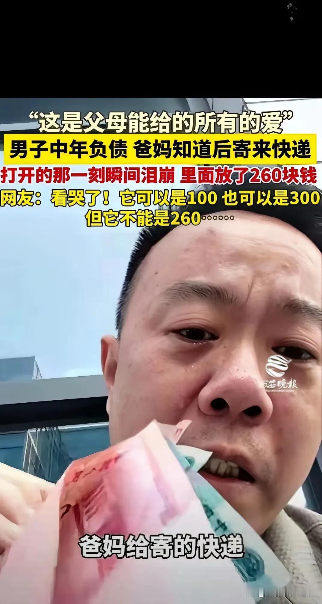 男子创业失败,打开父母寄来的快递,泪目了。男子在外地创业失败了,资金链断了,父母知道后非常挂念他,就给他寄来了一部分钱,当他打开以后,看到就寄来了260块钱。 网友很奇怪为啥不是300或200或更多,为啥偏偏是260块钱。其实这260块钱是俩老人的农村养老金,每人130块钱,俩人260块钱,这是父母唯一能拿得出结论的家底。父母对儿子的爱是无私的,100%的。男子泪目,换成谁都会哭起来。