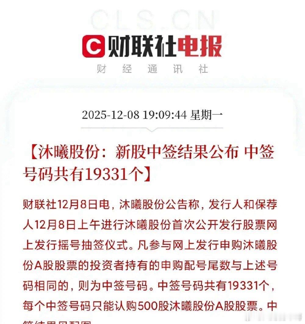 第二个摩尔线程来了!19331个幸运儿诞生了,单签收益能超20万吗?在老大哥摩尔线程,上市首日暴涨近470%,惊艳全场之后,另一位重要玩家——沐曦股份,即将登陆科创板。刚刚,沐曦股份公布了,其网上发行中签率,最终数字锁定在 0.03348913%。这意味着,每一万个申购号里,只有大约3个能中签,热度超过了之前的摩尔线程。共产生了19331个幸运儿。为什么市场如此追捧?1. 赛道火热:沐曦股份和摩尔线程一样,同属高性能通用GPU,这条炙手可热的黄金赛道。摩尔线程上演了,中一签赚26万的造富神话后,市场对下一个是谁,充满了期待,希望复制同样的传奇。2. 豪华朋友圈:沐曦股份的背后,站着一排令人瞩目的战略投资者。国家人工智能产业投资基金领投,中国电信、京东、美团等产业巨头跟投。这种“国家队+互联网巨头”的联合加持,不仅提供了资金,也传递出,产业资本对其技术路线,和商业前景的深度认可。3. 更早的盈利预期:沐曦股份给出了盈利时间表——公司预期最早在2026年,达到盈亏平衡点。这份可预期的商业化能力,在注重实际产出的市场环境中,是一个重要的加分项。市场在期待什么?根据发行价104.66元计算,沐曦股份市值约为419亿元。市场现在关心的问题是,它上市后能涨多少?我们以摩尔线程作为参照。如果沐曦股份首日涨幅,也能达到类似的水平,其股价可能冲击500元左右,市值有可能将超过2000亿元。中一签,收益可能超过20万元。对于我们来说,这意味着什么?1. 打新热情依旧:极低的中签率表明,无风险套利的打新策略,在热门硬科技股上,依然有效,但中签概率和中彩票差不多。2. 警惕情绪波动:首日暴涨,由非理性狂热和稀缺性驱动,股价往往严重透支未来。参与炒作需格外谨慎,避免在情绪高点,成为接盘侠。沐曦股份的登场,为2025年国产芯片上市潮,再添一把火。它让我们看到,资本正在以比较强的热情和耐心,为我们国家的硅基未来投票。