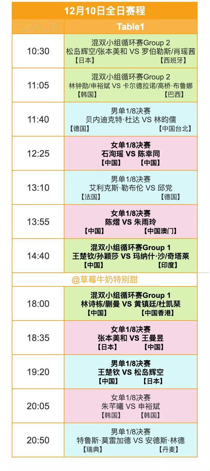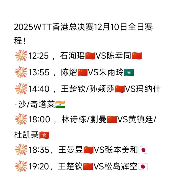 后天(12月10日,周三)赛程! 2025WTT香港总决赛12月10日国乒选手赛程如图一,全日赛程如图二。 总决赛前两天,进行单打的1/8决赛和混双项目的小组循环赛上午比赛从十点半开始,进行到下午三点左右,晚上六点开始,持续到八点多。 后天没有莎莎的单打比赛,中午有混双小组赛,但王楚钦上来就是单打、混双一日双赛,期待两人一切顺利。 后天晚上,栋曼组合、曼昱、大头都会上场,小伙伴们一起观赛哦。 (感谢草莓老师的图片)
