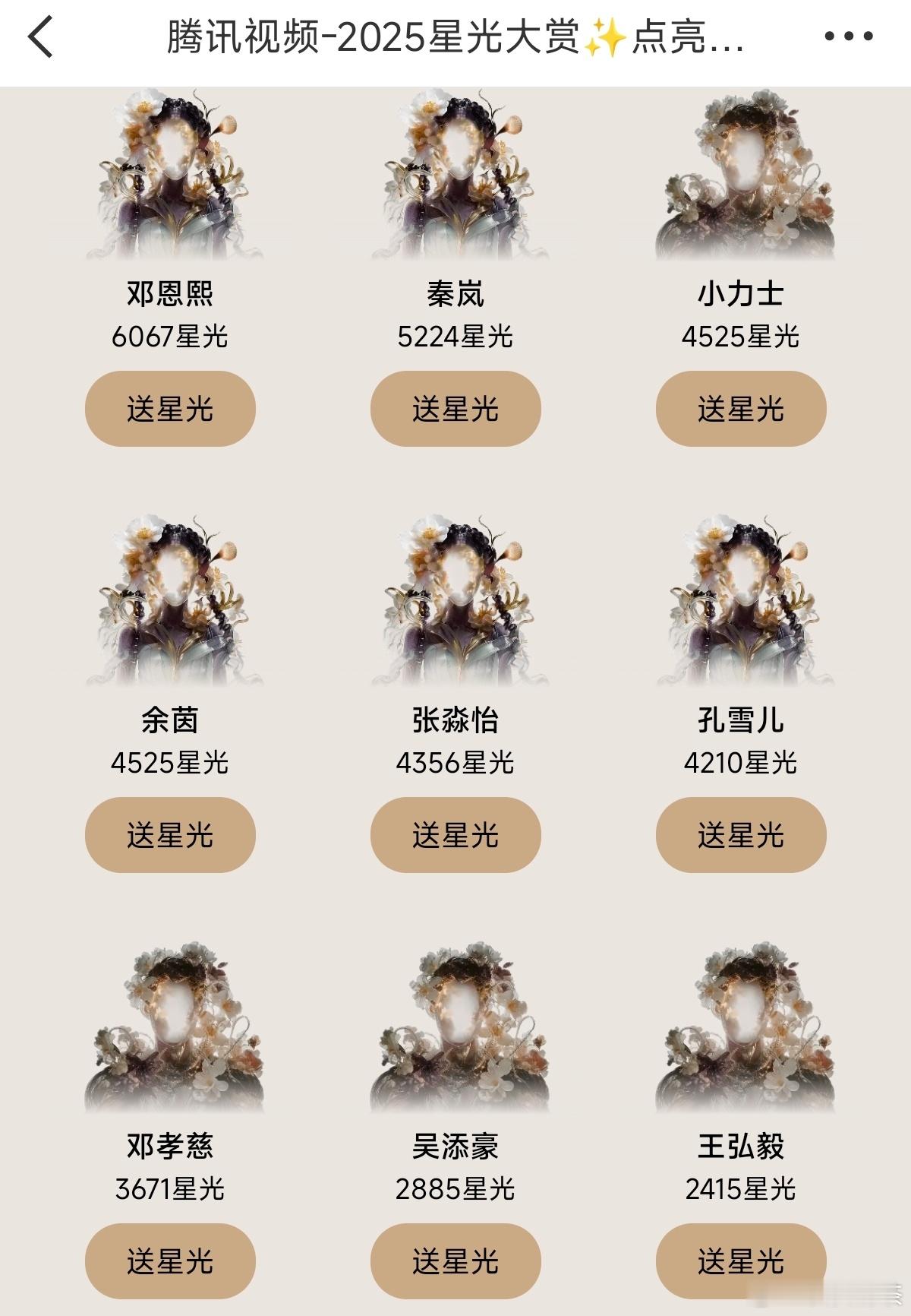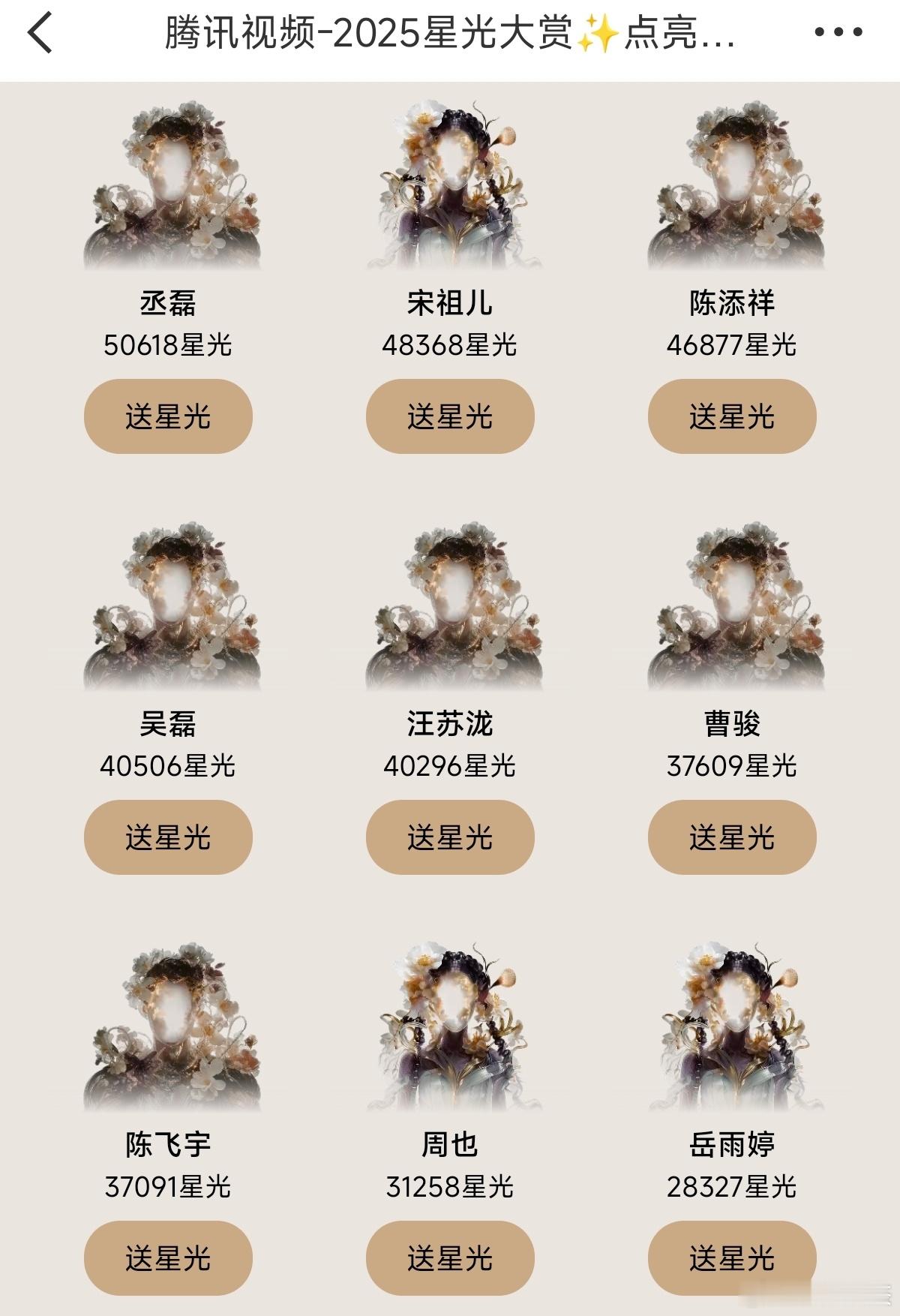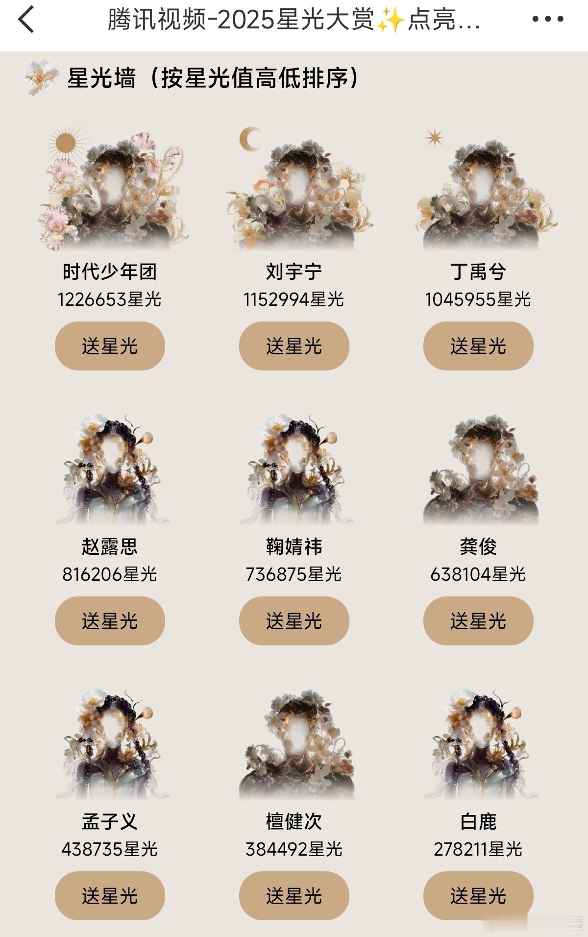 🌿:1时代少年团、2刘宇宁、3丁禹兮、6龚俊、8檀健次、10李昀锐、11张凌赫、12黄明昊、14何健麒、16王安宇、17刘萧旭、19丞磊、21陈添祥、22吴磊、23汪苏伦、24曹骏、25陈飞宇、28申浩男、29常华森、31张新成、32陈星旭、34辛云来、35黄俊捷🌸:4赵露思、5鞠婧祎、7孟子义、9白鹿、13陈都灵、15宋茜、18田曦薇、20宋祖儿、26周也、27岳雨婷、30孙乐言、33李兰迪、36王影璐2025星光大赏星光墙