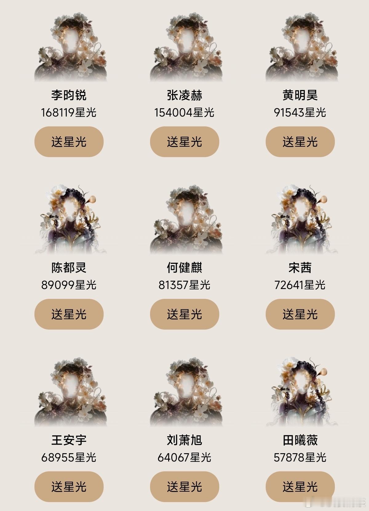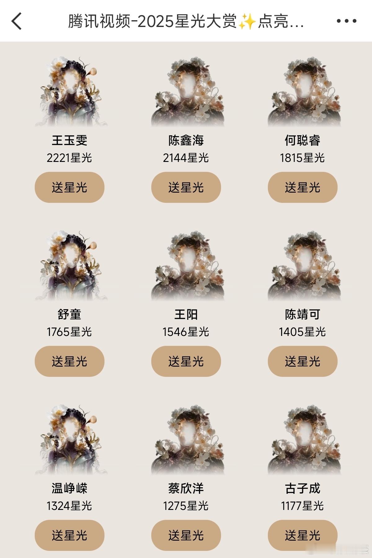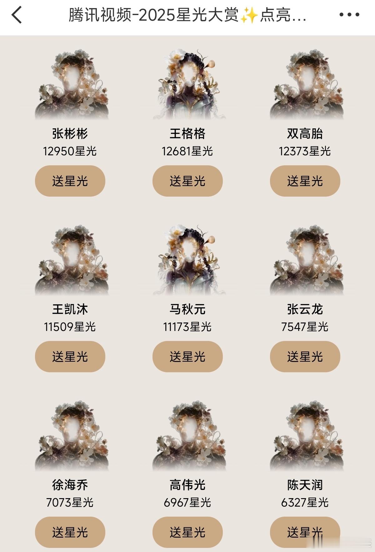 🌿:1时代少年团、2刘宇宁、3丁禹兮、6龚俊、8檀健次、10李昀锐、11张凌赫、12黄明昊、14何健麒、16王安宇、17刘萧旭、19丞磊、21陈添祥、22吴磊、23汪苏伦、24曹骏、25陈飞宇、28申浩男、29常华森、31张新成、32陈星旭、34辛云来、35黄俊捷🌸:4赵露思、5鞠婧祎、7孟子义、9白鹿、13陈都灵、15宋茜、18田曦薇、20宋祖儿、26周也、27岳雨婷、30孙乐言、33李兰迪、36王影璐2025星光大赏星光墙