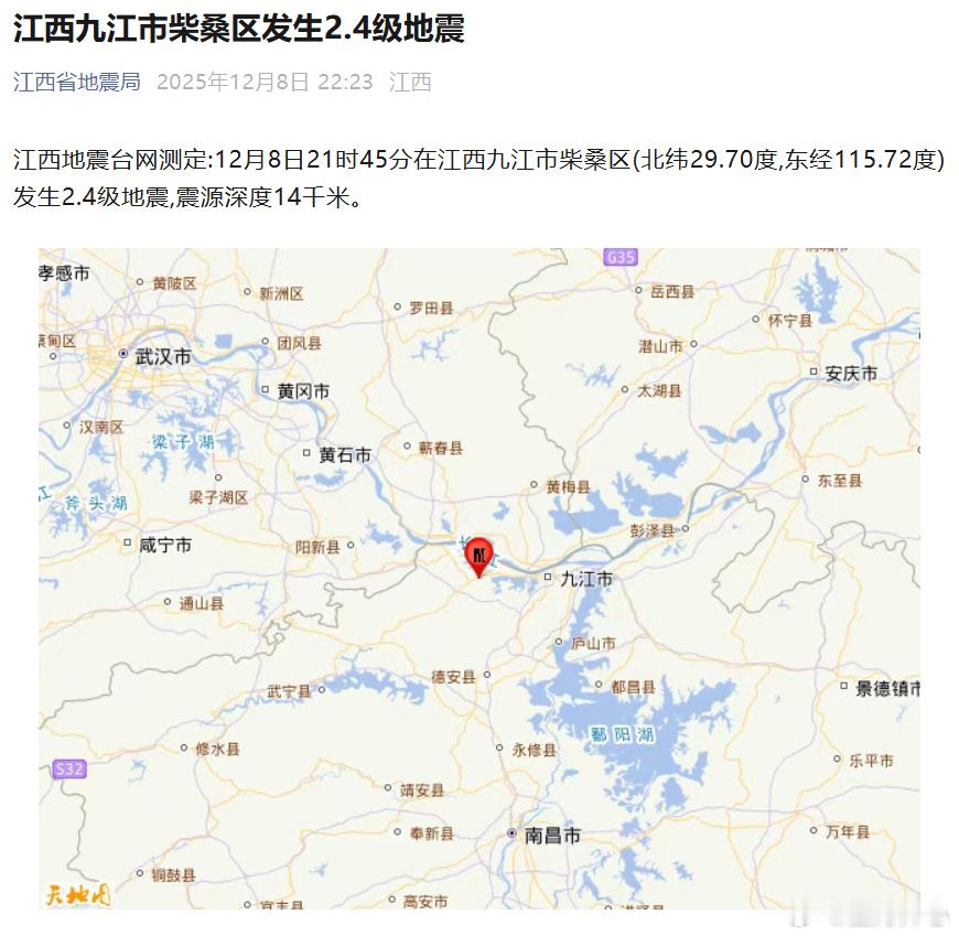 九江地震 江西地震台网测定:12月8日21时45分在江西九江市柴桑区(北纬29.70度,东经115.72度)发生2.4级地震,震源深度14千米。上一次亲身经历九江地震是在南昌的2005年