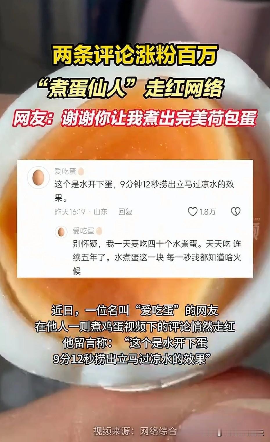 2025年末,抖音博主“爱吃蛋”火出圈了,两条评论就让粉丝从200人飙升到200万+,被封“煮蛋仙人”。事情起因是有人晒出金沙蛋黄蛋,评论区求配方,“爱吃蛋”留言“水开下蛋,9分12秒捞出过凉水”,还说自己连续5年每天吃40个水煮蛋。网友按这方法煮蛋,成功率超高。被追问时,他又秒回溏心蛋“7分11秒”秘诀。他的无滤镜煮蛋对比视频播放量破2亿。他把煮蛋这件小事做到极致,精准干货、真实感和评论区价值输出,远比刻意营销强,平凡事做到极致真能发光。