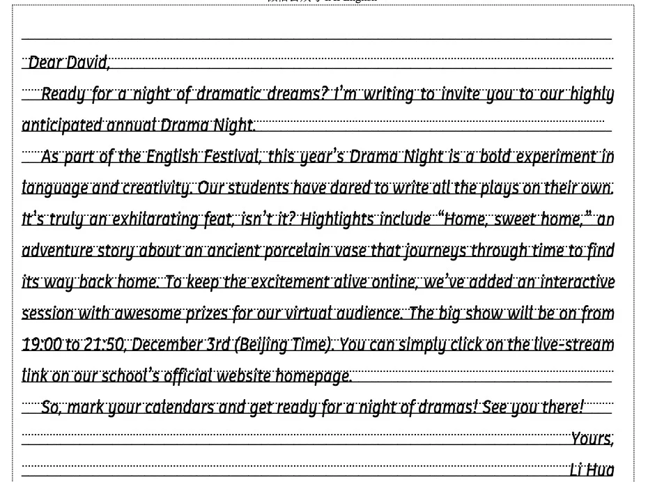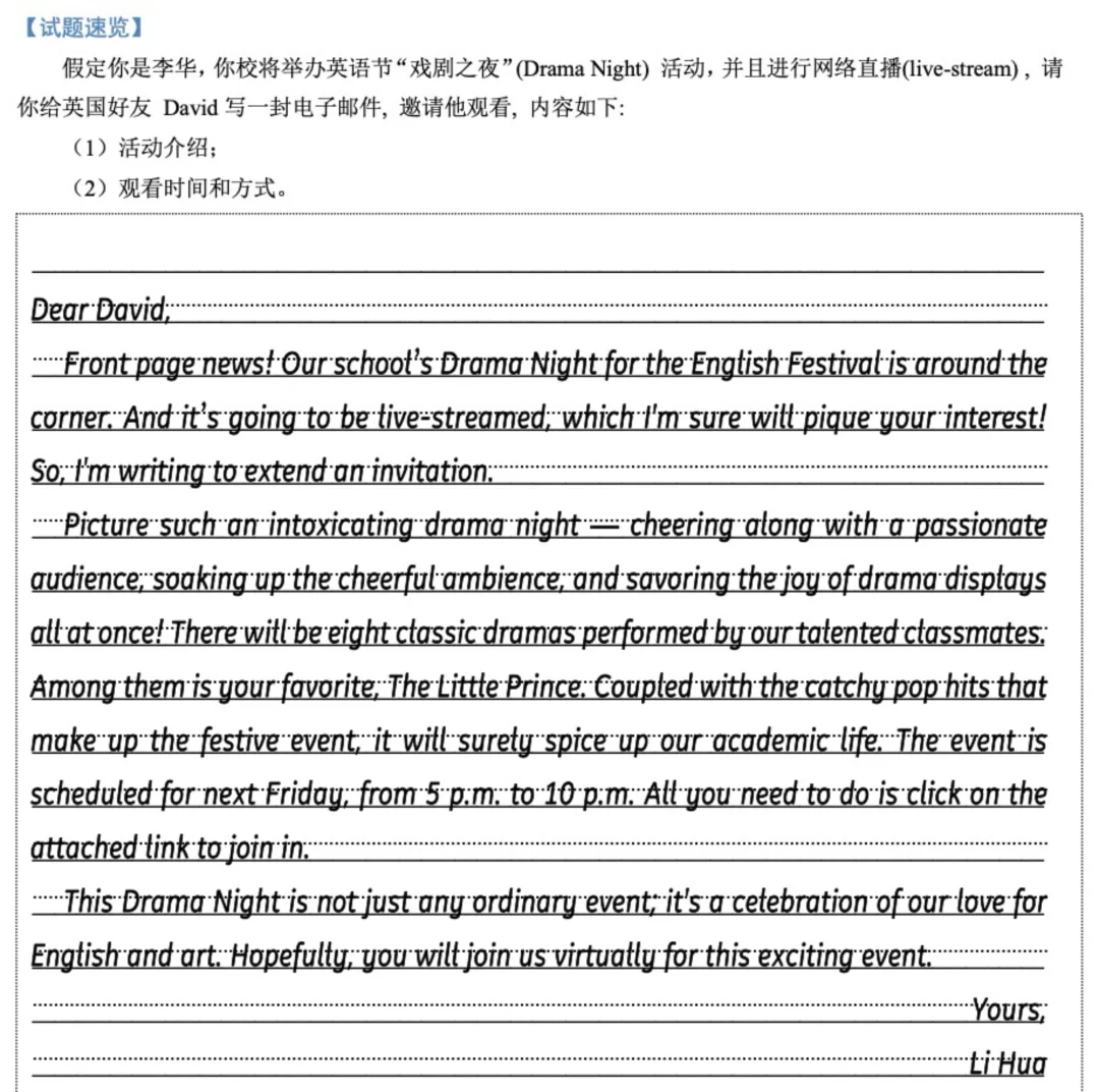 这个应用文无论是话题还是要点设置都比较常规,写这篇的意义是,这个题目可以作为一个很好的复习的载体。这个题目其实涉及到了很多我们讲过的知识,比如1️⃣在用一种文化载体(歌曲、戏剧、电影等)去做文化交流的时候,我们可以采取“建桥”的思路去设计具体的活动。母题是与姐妹学校“共上一堂课”介绍各自的传统节日,我们当时给的破题之法是寻找内涵相通的节日,在两个国家之间“建桥”。 当我们把“传统节日”换成其他事物,比如“线上音乐会”(四省联考)、“戏剧之夜”(这个题目)时,这个思路仍然是可行的,就像外研社必修二第四单元的标题“When Hamlet meets Peking Opera”。