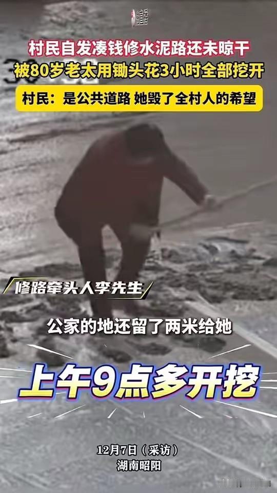 邵阳,这座洋溢着淳朴与热忱的乡村,近日却因一桩令人嗟叹的事件,成了众人瞩目的焦点。村民们自发筹措资金修建一条水泥路,本意是改善村庄的交通状况,让出行更为便捷。然而,事情的走向却出人意料,令人倍感无奈与惋惜。 事情源于村民们的一片善意,大家集资修路,盼着能为村庄增添一份便利。经过齐心协力的努力,水泥路已初具雏形,村民们满心欢喜地期待着新路落成。可就在水泥尚未彻底干透、还带着些许湿润的时候,一位80岁的老太太突然现身。她手持锄头,耗时整整三小时,把刚铺好的水泥路尽数挖开。 老太太的举动令人惊愕,也让人难以理解。她坚称这条路占了她家的地。“这并非她家的地,公家修路还给她留了两米,可她非要把修好的路挖掉。”负责人无奈地说,“全村人的希望都被她毁了。”原来,老太太认定这条路侵占了她的土地,尽管官方和施工方都明确表示这是公共道路,且预留了充足空间,她依旧固执地将路挖开。 此事折射出农村土地权益与公共设施建设中存在的复杂矛盾。一方面,村民们怀着善意,积极投身改善生活条件的行动;另一方面,土地权属的模糊以及个人利益的捍卫,让公共工程遭遇阻碍。老太太的行为虽极端,却也体现出一些老一辈对土地的深情眷恋和对自身权益的坚守。 村委会和相关部门面对这一状况,显得无计可施。报案未能解决问题,挖掘已成事实,村民们的希望似乎也随之破灭。这起事件不仅令人惋惜,更引发了人们对土地管理、公共设施建设与个人权益保护的深刻思考。 或许,解决问题的关键在于事前充分沟通与协商。尊重老一辈对土地的情感,同时明确公共利益的边界,方能在未来避免类似冲突。毕竟,建设美丽乡村,离不开每位村民的理解与支持。希望邵阳的村民们能从此次事件中汲取教训,携手努力,为村庄的未来营造更加和谐美好的环境。