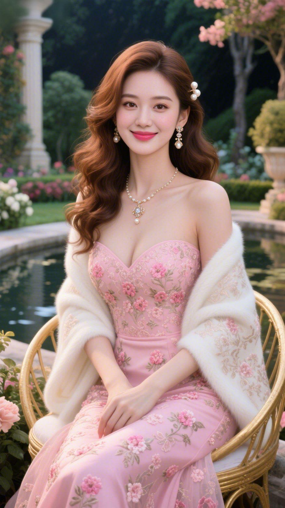 晚风遇繁花 晚风轻绕庭院,蔷薇的馨香漫入暮色。她静坐在鎏金椅上,粉色裙装如春