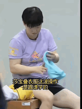 这师徒俩主打一个“复制粘贴式同步”——前一秒看莎莎叠衣服,那叫一个细致规整,我正在感慨“终于有个会收拾的了”,下一秒直接摆烂:“过去把你”(摆烂版叠衣术),合着刚才的仔细是演给镜头看的? 仁川看雨果那场更绝,师徒俩在看台上的表情同频到像复制粘贴,莎莎还偷偷藏起半张脸装不好意思,主打一个“社牛师傅带出没完全社牛的徒弟”。 训练饿了更默契,俩人凑一块儿冲肖战讨吃的,这“啃老”速度~是“啃老界冠军师徒”都不过分,主打一个“有福同享,有吃同讨”!