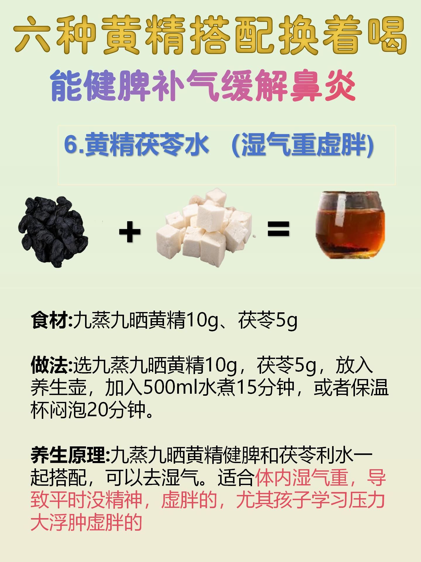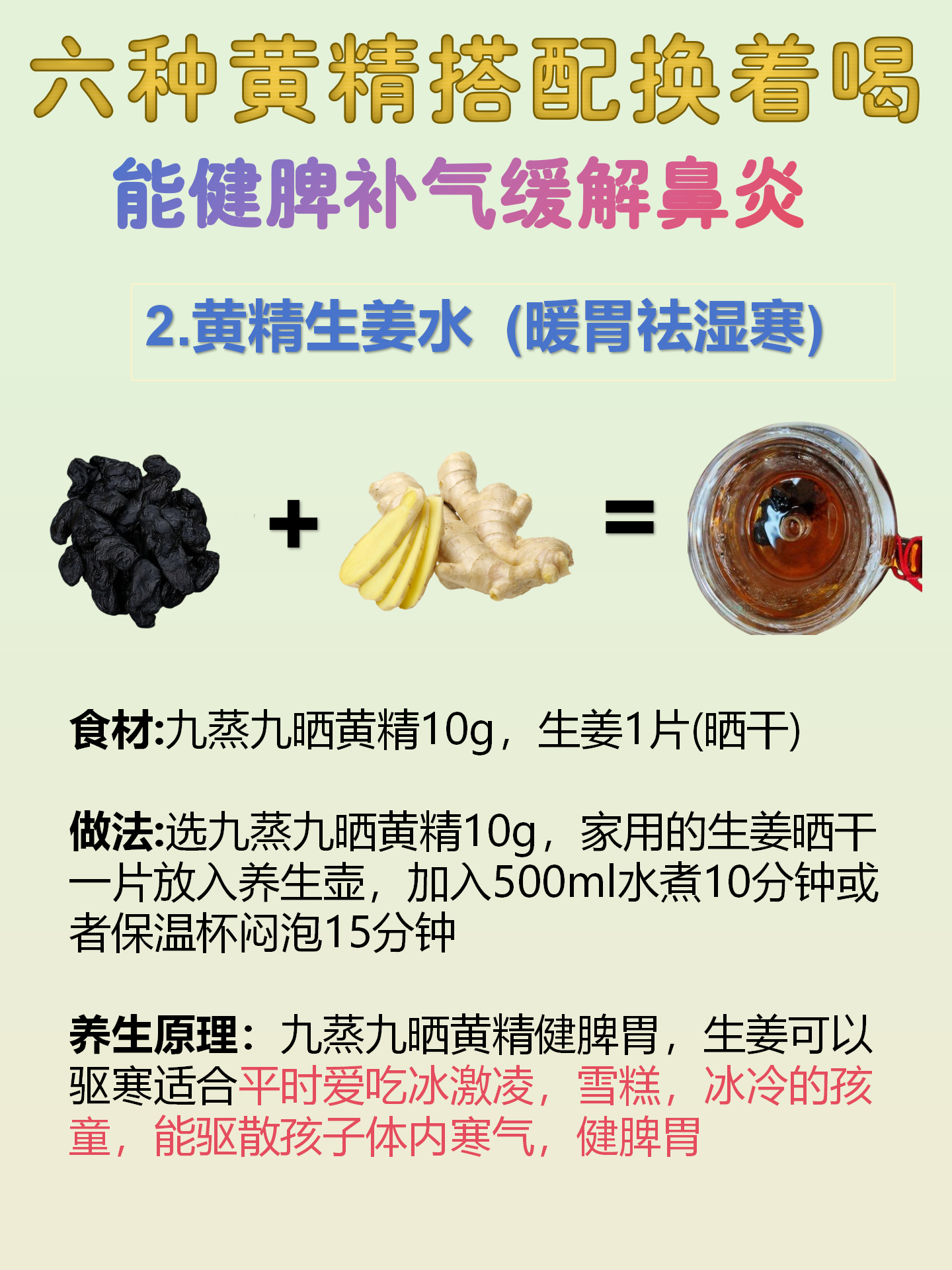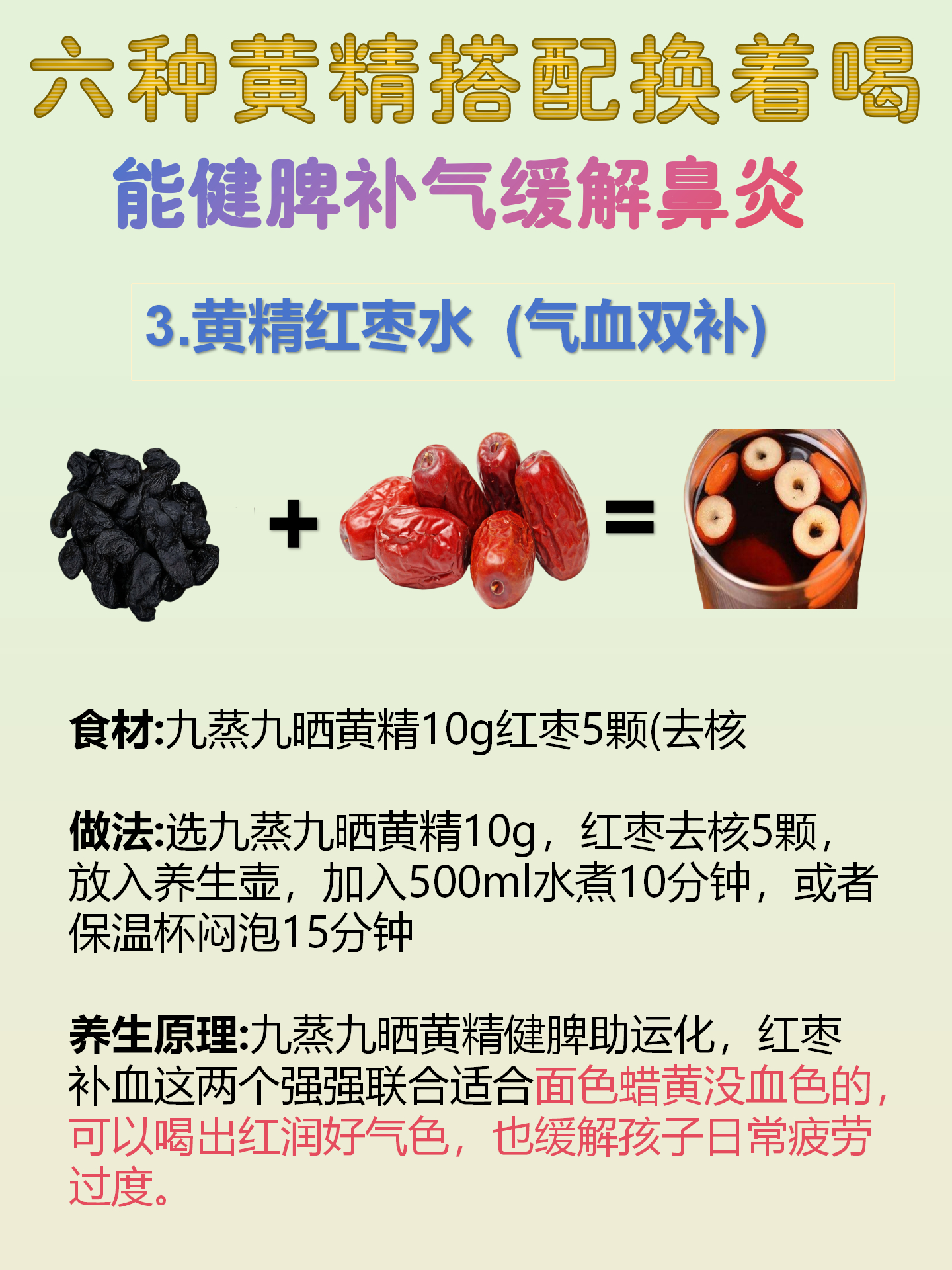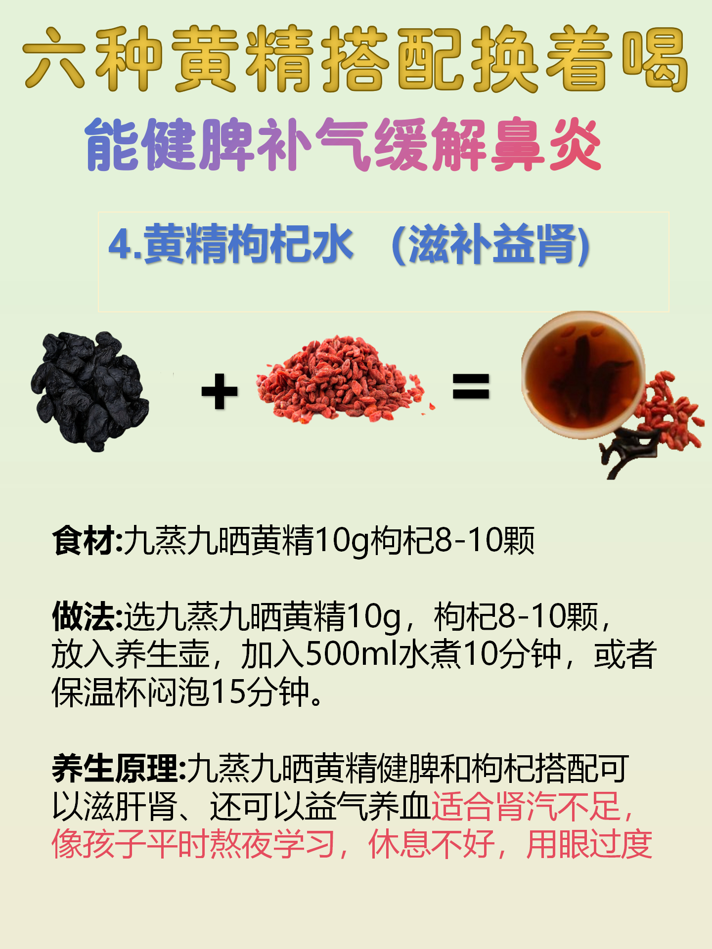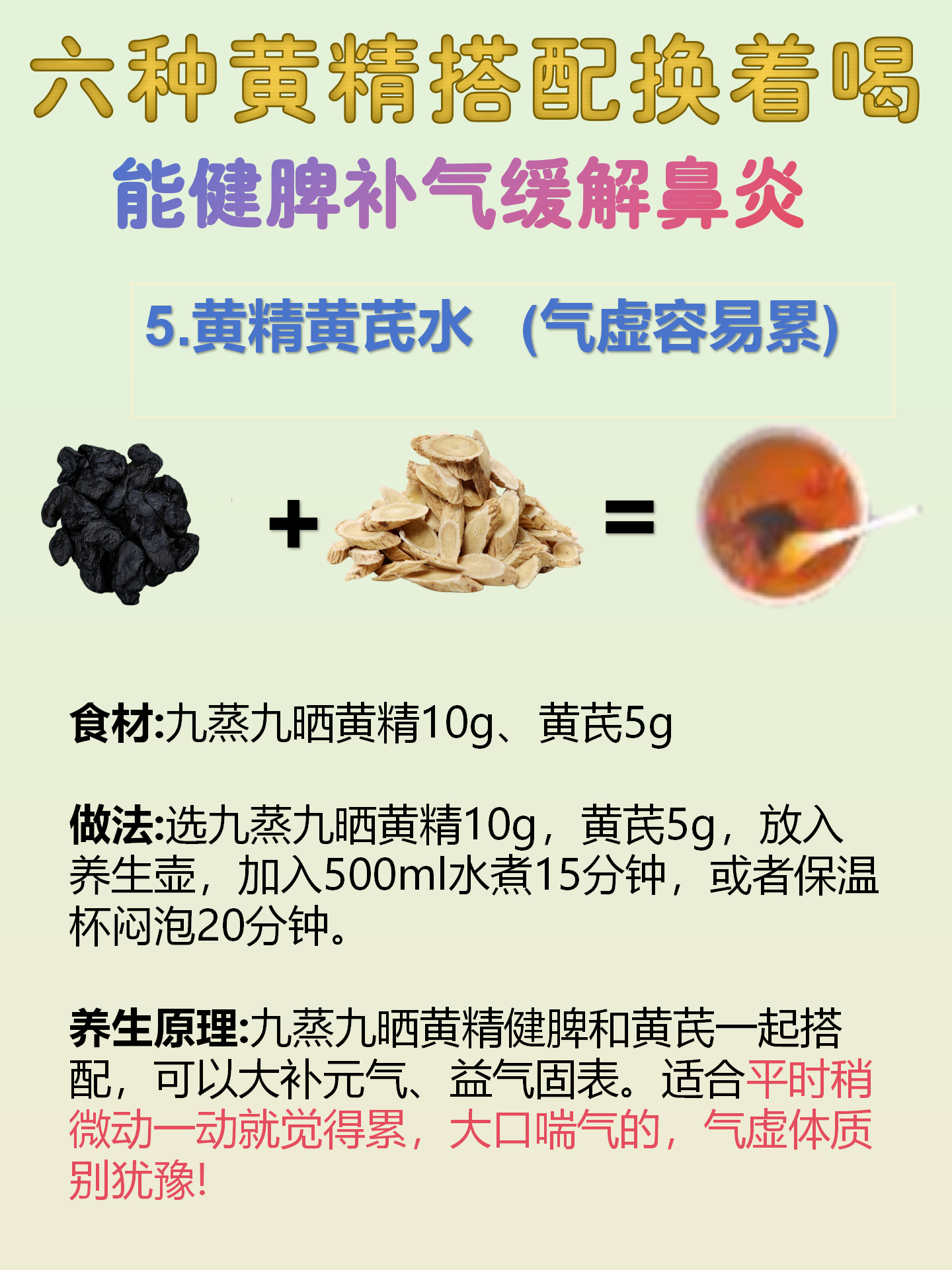 6种黄精搭配换着喝,健脾补气,鼻炎反复也能缓!很多人以为鼻炎只是鼻子的问题,其实中医认为:反复鼻塞、流清涕、打喷嚏,多与“肺脾气虚、卫外不固”有关。尤其是换季就犯、一吹风就流涕的人,往往是脾肺气弱,抵抗力差。这时候,光靠洗鼻、抗过敏药只能治标。真正要减少复发,得从健脾补气、扶正固表入手。而黄精,正是温和补气养阴、健脾益肺的好帮手——尤其搭配不同食材,效果更精准。下面6款简单煮水方,每天一杯,坚持喝,鼻腔舒服了,人也更有精神!国医的精诚力量
