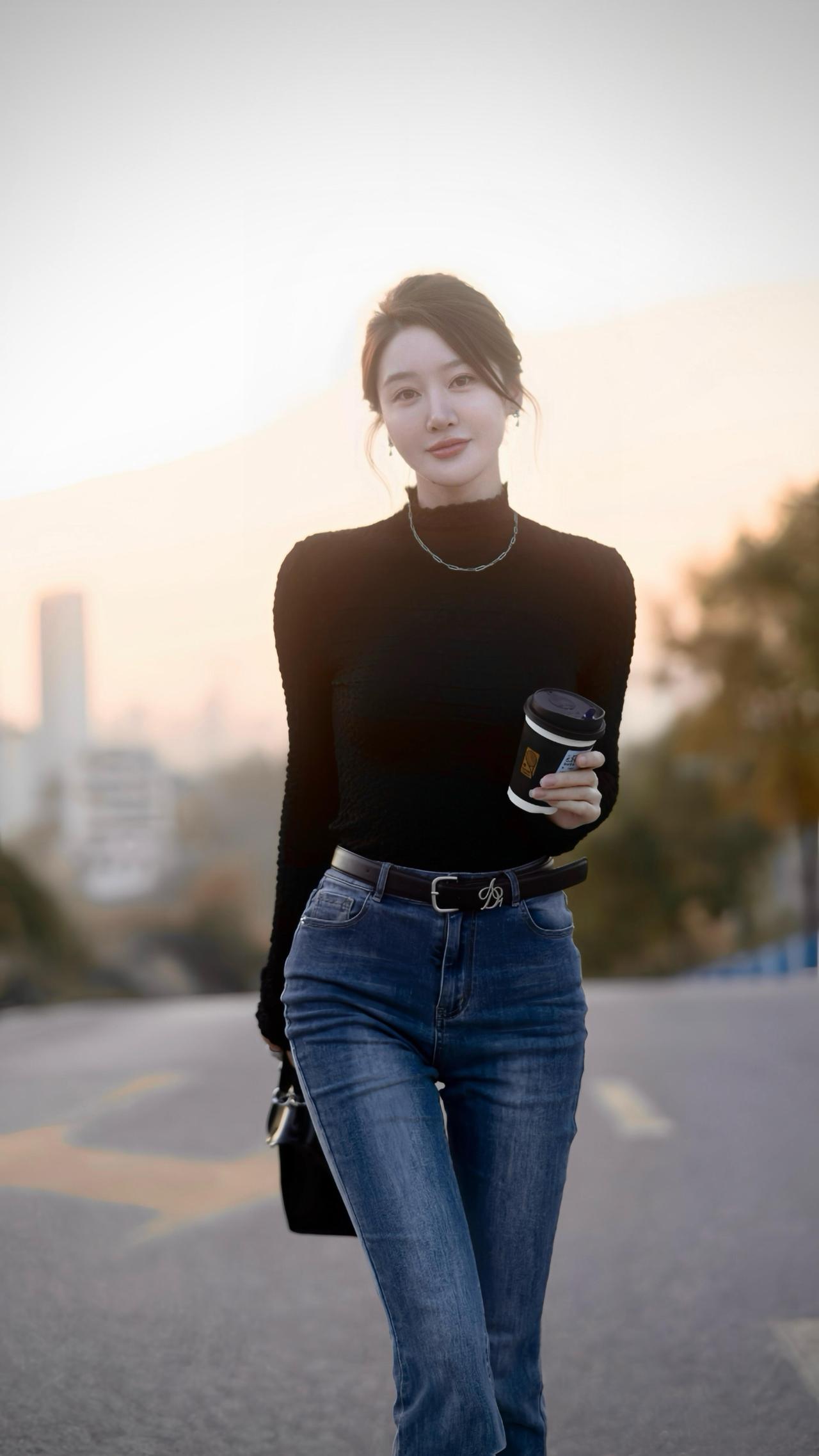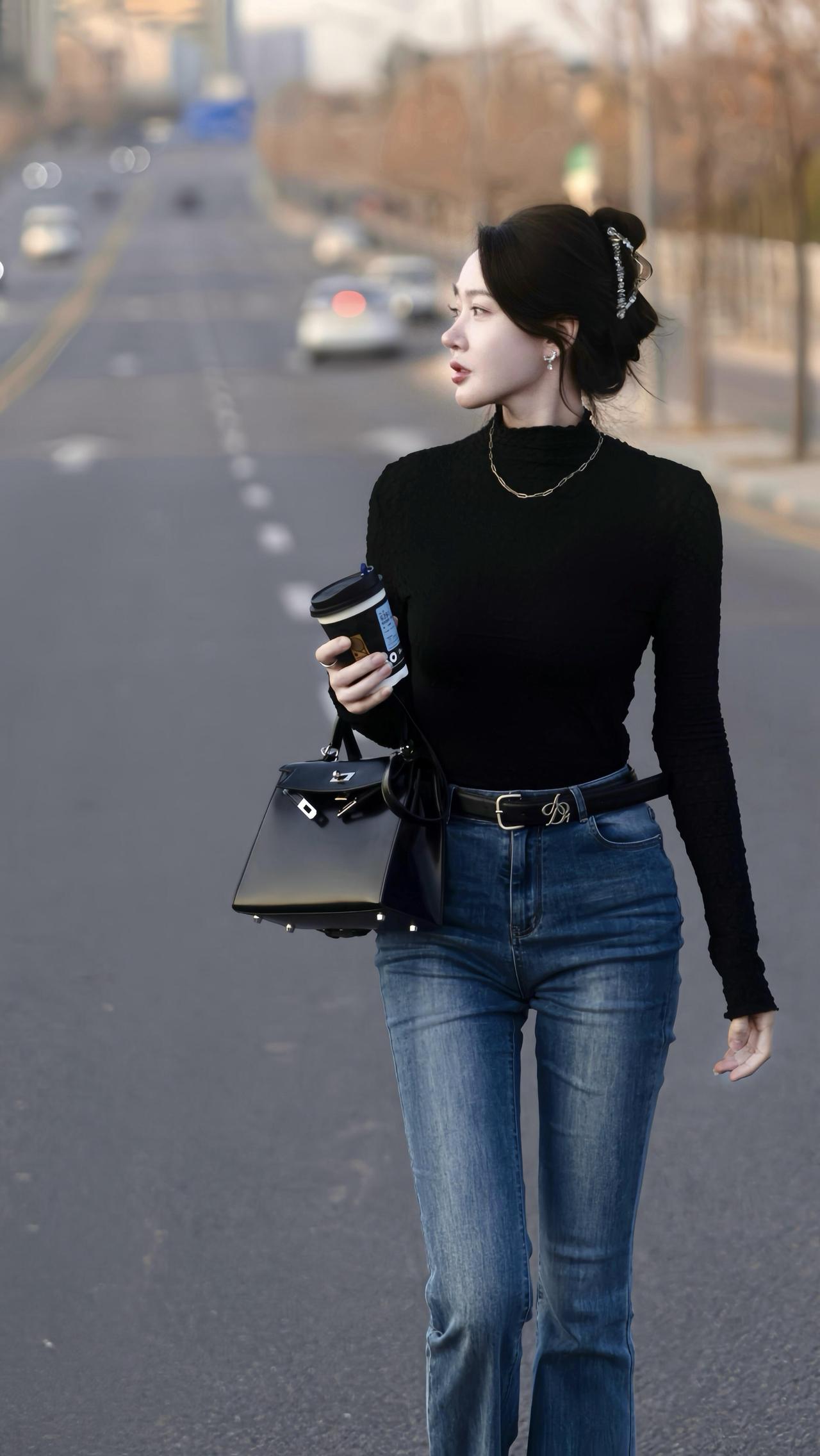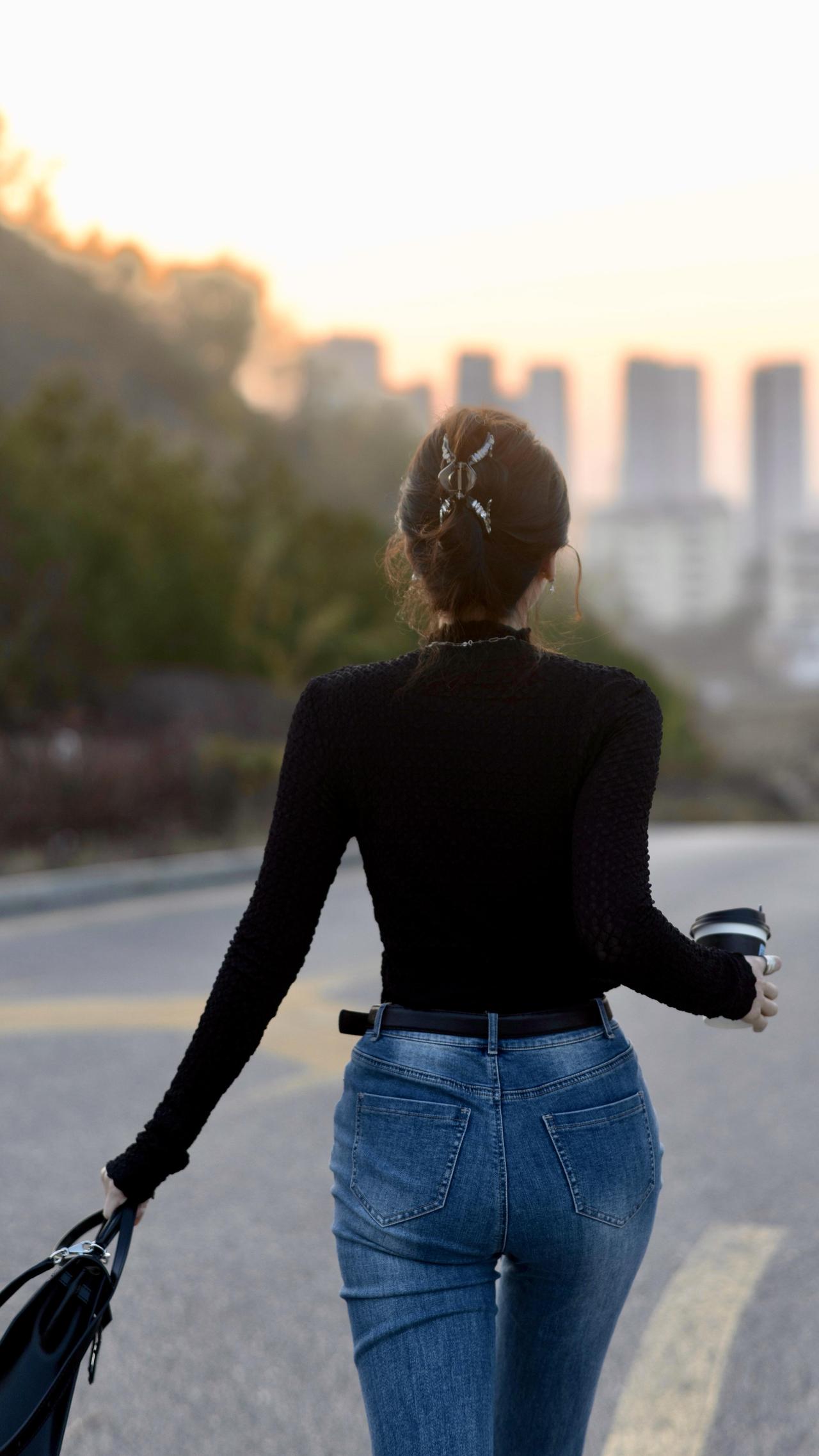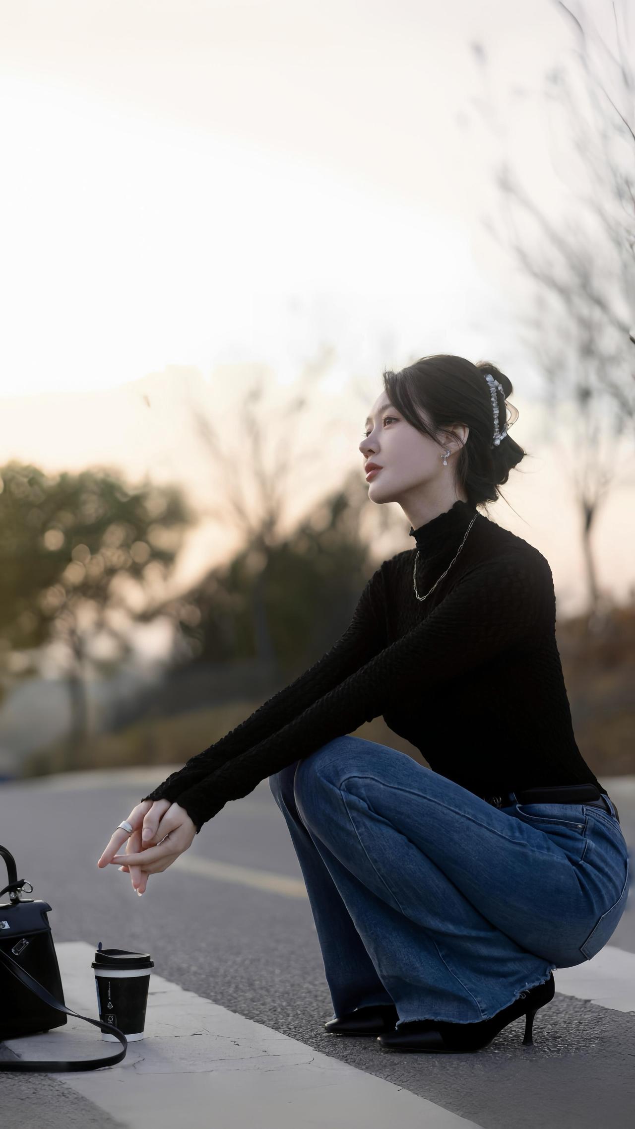 暮色晚风里 黑针织的纹路裹住落日的余温 牛仔蓝漫过路面,像揉皱的海 她蹲在晚风里 指尖碰着咖啡杯的凉 目光越过城市的轮廓 把心事轻放 起身时,皮带扣的金属光 蹭过暮色的软 手提包晃在身侧 装着未说的温柔,和独行的坦荡 仰头饮下一口热意时 风掠过发间的发簪 碎光落满肩头 转身走向前路的背影 被车窗框成一幅温柔的画 城市在身后慢慢褪色 而她是晚风里 最清醒的浪漫 是奔波日常里 给自己的,一场不慌不忙的盛放牛仔高级感 牛仔光影绝韵