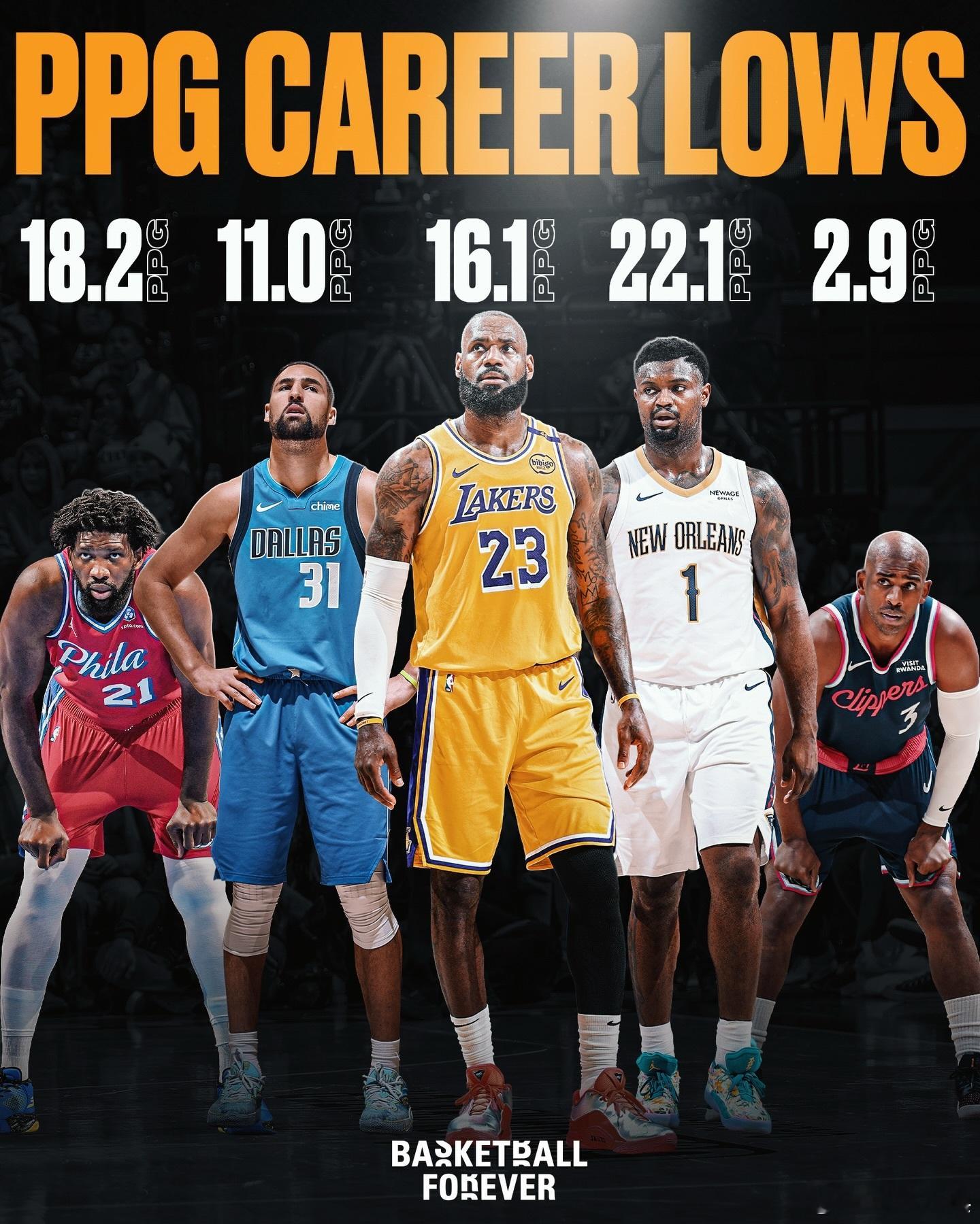 没人能敌过岁月,本赛季这些NBA球星正经历生涯低谷年👴🏼勒布朗·詹姆斯:场均16.1分克莱·汤普森:场均11.0分锡安·威廉姆森:场均22.1分乔尔·恩比德:场均18.2分克里斯·保罗:场均2.9分