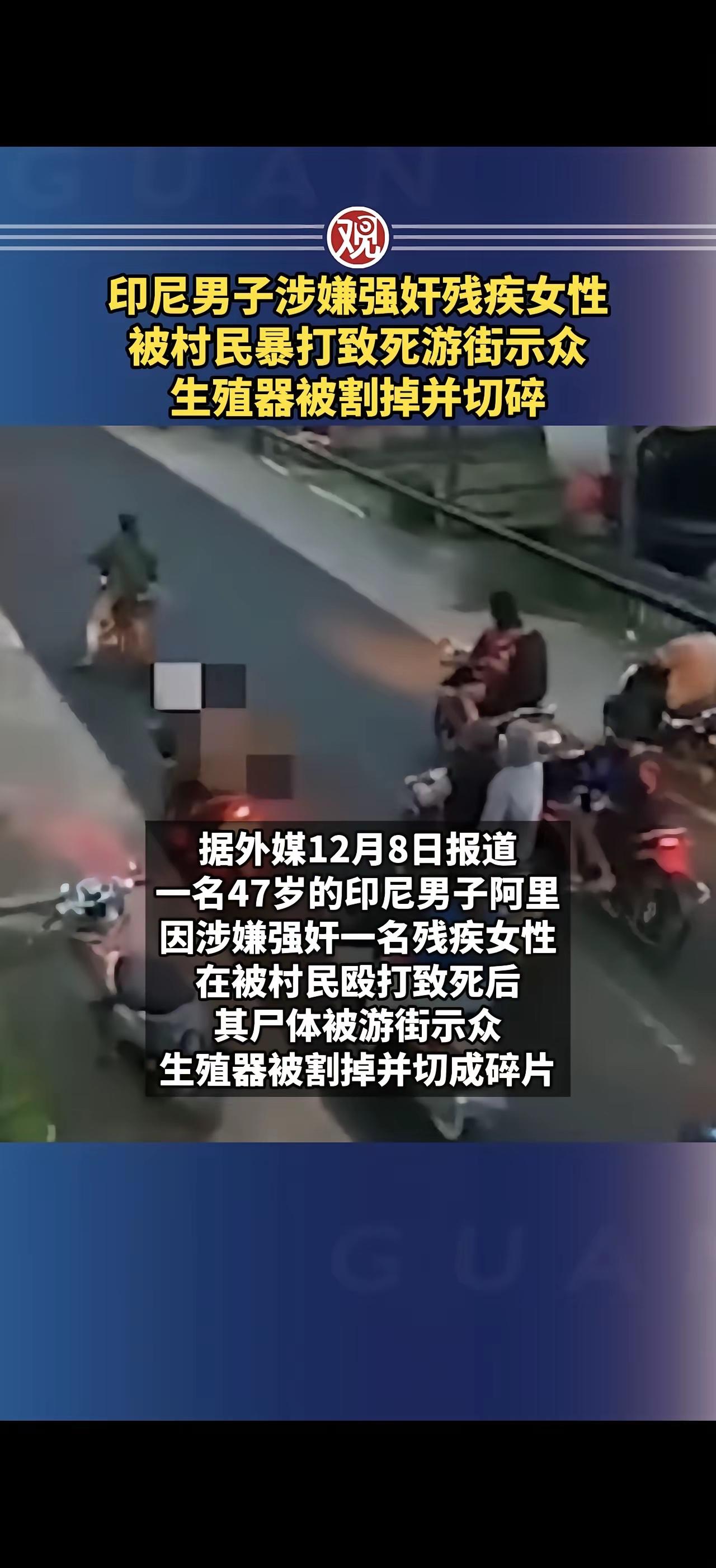 印尼村民把“强奸残疾女性的男子殴打致死,把生殖器割掉并切碎”,看来村民的怒火是无法忍受的。 强奸一名残疾女性,如此犯众怒的事,确实容易引爆村民的怒火。 印尼作为穆斯林国家,对强奸犯罪处罚本就十分严厉,属于是零容忍!这名男子强奸残疾女性的罪行更是不能容忍。
