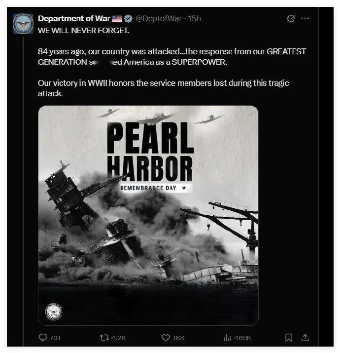 美国国防部:我们不会忘记! 北京时间12月7日晚10时,已经改名为“战争部”的美国国防部,在其官方社交账号发布了一则纪念美国珍珠港遇袭84周年的纪念海报,并配文:我们永远不会忘记! 这句话看似在表达对历史的铭记与哀悼,但没过多久,这则帖文就被网友盯上了,因为它出现了两个极为敏感的问题。 第一个问题其实让人有些意外。作为一则纪念珍珠港事件的官方内容,帖文中既没有点明袭击者是谁,也没有提到日本这个国家的名字。 这让不少网友感到困惑甚至愤怒,因为珍珠港事件本就是二战时期美日之间的一个重大转折点,日本海军对美国太平洋舰队的突袭直接导致美国对日宣战,正式加入二战。 如今美国国防部却在这种关键节点选择“回忆”,却又不敢讲清楚是谁让它“永远不会忘记”,这让不少人觉得这场纪念更像是一种“表演”,而不是认真的历史回顾。 第二个问题则是海报本身的设计。有眼尖的网友发现,这张纪念图像的风格更像是宣传片,把战斗场面当成视觉焦点,甚至让人误以为是一部战争电影的预告图。 在一个本该庄重缅怀的场合,配图却如此“娱乐化”,不免让人怀疑美国国防部是否真的在意这段历史。尤其是在当前全球安全环境复杂多变的局势下。 美国选择在这个时机发出这样一条含混不清的纪念信息,实在难以让人忽略其背后的用意。这条帖文之所以在中日美三国舆论场中迅速发酵,还有一个大背景不得不提。 就在几天前,日本政界人物高市早苗因发表错误涉华言论,引起中国方面强烈不满。高市的表态不仅引发中方抗议,也让外界重新审视日本政坛内部对历史问题的态度。 而美国作为日本的主要盟友,在这种时候突然高调纪念珍珠港,虽然没有指名道姓,但其“我们不会忘记”的语气,立刻被外界解读为一种微妙的姿态释放。 美国近年来在对待历史问题上确实显得越来越模糊不清。比如针对二战中的日本战犯问题,部分美国政客在公开场合的表态越来越少提及日本的战争责任。 而是更倾向于强调“和平同盟”和“共同价值观”。这种选择性记忆的现象,其实已经不是第一次出现。更早些年,美国前总统曾访问广岛。 却没有向日本提出任何战争责任问题,反而在讲话中强调“战争的惨痛教训让我们珍惜和平”。这种话听起来很动人,但问题在于,如果连历史的起点是谁都不愿意承认。 这样的“和平”到底是建立在什么基础上的?珍珠港事件本身是一个无法回避的历史节点。1941年12月7日清晨,日本海军对珍珠港发动突袭,造成大量美军伤亡。 也让美国彻底改变了其孤立主义立场,开始全面参与二战。这个事件在美国历史教科书中被称为“国耻日”,每年都会举行纪念活动。 但今年这则帖文却让人怀疑,美国是否还保有那份对历史的严肃态度,还是说它开始将历史当作一种可以随意剪裁的宣传工具。 这并不是一个孤立的例子。前不久,美国在处理与菲律宾、越南等国的军事合作议题时,也常常用二战历史做为舆论引导的工具,但从不真正触碰那些敏感的历史责任问题。 这次珍珠港纪念帖文的“失误”,其实暴露了美国在处理历史与现实关系时的尴尬处境。一方面它要展示对历史的重视。 另一方面又要维持与日本的战略同盟关系,于是只好模糊化处理这段历史,把“凶手”三个字从画面中删去。不少观察者指出,美国近年来对历史的处理越来越“实用主义”。 只在需要时提起历史,却从不真正面对历史。这种做法短期内或许能避免尴尬,但长远来看,只会让外界越来越怀疑其所谓“价值观外交”的真实意图。 如果连对自己历史创伤的纪念都要顾左右而言他,那美国所谓的“不会忘记”其实也早已变了味。有意思的是,日本方面并没有对这则帖文做出任何公开回应。 或许也是心知肚明,这种含糊其辞的纪念方式,反而是一种变相的“配合”。毕竟近年来日美之间在亚太地区的军事联系越来越紧密。 双方都不愿意让历史问题成为合作的“绊脚石”。只是这样的处理方式,不仅无法真正平息历史遗留下来的矛盾,反而让人看清了所谓“盟友”之间的底层逻辑。 历史本来就不该被选择性记住。美国国防部这次贴文引发的争议,其实并非偶然,而是长期以来对历史态度的一个缩影。当“我们不会忘记”变成了一句没有指向的口号。 真正被淡忘的,或许正是那些曾经付出生命代价的普通士兵,以及他们背后那段本该被认真对待的历史。