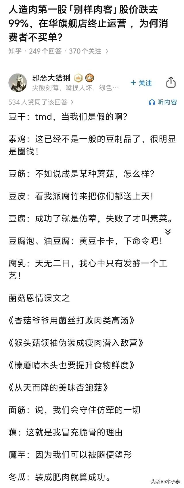 生姜:红烧使我看起来像肉[大笑] 家里长辈拜观音的时候买了好多惟妙惟肖的素菜[马思纯的微笑]甚至还有素鹌鹑蛋 而且就这?你是说你要在吃了上千年黄豆,并且开发了成百上千种豆制品的大豆原产国面前,鼓吹捣鼓才区区几年的豆制品,而且还要高价卖给我们?我们看起来像傻子吗?笑死!素食