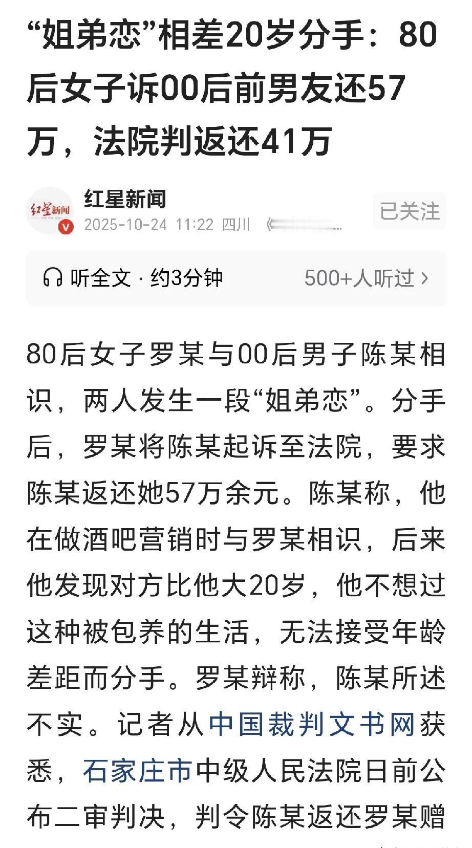 石家庄,25岁酒吧男子,与45岁富婆谈恋爱,男子3年收57万后,富婆要求结婚。可没想到,男子嫌富婆年纪大,因此提出了分手。 这下富婆怒了,一气之下把男子告上法院,并要求返还这57万。男子不服,说自己是被包养的。两次审理之后,判决下来,男子直接傻眼了! 25岁酒吧男子陈某,年轻帅气,十分讨人喜欢。 由于他工作的特殊环境,所以很快认识了很多有钱有闲的女人。而罗某就是其中一个。80年出生的罗某,虽然已年过40岁,但因为有钱,会保养又会打扮,所以整个人看上去比实际年龄要青春靓丽很多。 而且,40岁的女人,正是风韵俱佳的年纪,一举一动,一颦一笑之间都包含成熟和风情,很有熟女的味道。 来酒吧消遣的女人,多数都有点寂寞,渴望有人陪伴说说好听的话。而且,罗某还是单身,所以更加期待有一段奇遇能够让她转角就能遇到爱。 很快,罗某就注意到了年轻英俊的陈某。毕竟一张好看的脸,一个青春的身体真的足够吸引人。 而陈某,卖酒陪好客人本身就是他工作的一部分,而长得帅气又给他增分不少,所以对于罗某,自然是很快就敏感的捕捉到了这个女人的“意思”。 从此,陈某便更加殷勤示好,目的当然是让罗某多掏钱买酒。他也好多赚点。 罗某自然心知肚明,但也确实挺喜欢这个能言善道年轻俊朗的小伙子,所以更加的出手阔绰,照顾他的生意。甚至还会私下给他转账表达自己的喜欢。 很快,两人在一起了! 罗某是本着结婚去的,毕竟已经也到一定年纪了,能遇到个自己喜欢的也不容易。而陈某想得是,自己需要钱,抱着罗某这个大腿日子总会好过些。说不定将来有这个富婆的“支持”自己也能混得风生水起的。 上海是国际大都市,罗某现在又特别喜爱他,他想借力往上爬。也是无可厚非的事情。 所以,在罗某决定去上海时,陈某也便跟着一同前往了。 而罗某对这个次自己小20岁的小男友也算是真心真意。所谓爱他就给他花钱,这一点用在男人身上也同样适用。 因此,罗某会时不时给小男友转520,1314这样的示爱红包。还经常转账给他钱花。 原本陈某以为,大家都是成年人,这种事情也是你情我愿的事,不要讲的太明白,谈恋爱就谈就好了。 可让他意外的是,罗某是奔着结婚生子去的。可如此一来,陈某就有点接受不了了。毕竟有20岁的年龄差距呢!随后,陈某提出了分手,理由是自己还年轻,不想再过这种被人养着的日子了。 可如此一来,罗某就不愿意了。因为在罗某看来,我跟你谈恋爱,给你钱花,就是为了跟你结婚。 你现在占了我的人,花了我的钱,浪费了我的时间,却以一句年龄有差距就提分手,那肯定不能接受。 于是,罗某一气之下把小男友告上了法庭,要求返回给他转账的57万,说这不是白给的,是有条件的赠予,而条件就是结婚生子。 起初,陈某还不服气,说自己是被包养了,这钱是自己做贡献的费用,退不了。不过,法院最后判了,有条件的赠予必须返还。 但鉴于陈某也给罗某转过几笔小钱,共计1万元,所以最后需要返回47万就好了。 这段故事表面是感情纠纷,其实是两颗各打小算盘的心碰在一起。 罗某想用金钱换真心、换婚姻,陈某想用青春换捷径、换资源。 一个以为钱能买到爱情,一个以为年轻就是筹码。结果条件没达成,钱就要还,梦醒了,谁都不好看。 法院的判决也提醒我们:有条件的赠予,一旦条件落空,就要返还。 感情不是交易,婚姻更不是合同。走捷径的人,迟早要为捷径买单。踏实赚钱、真诚爱人,才是长久之计。 你们觉得呢?