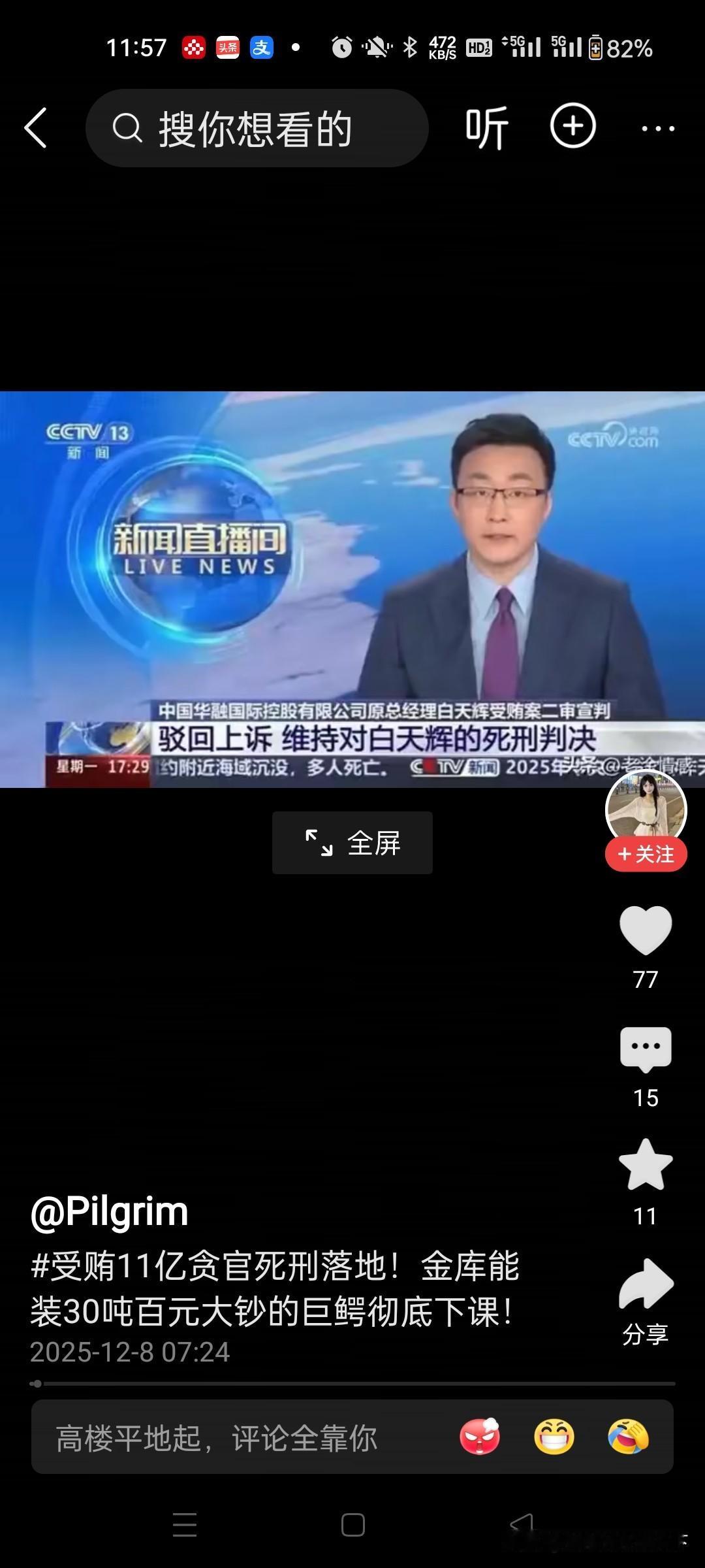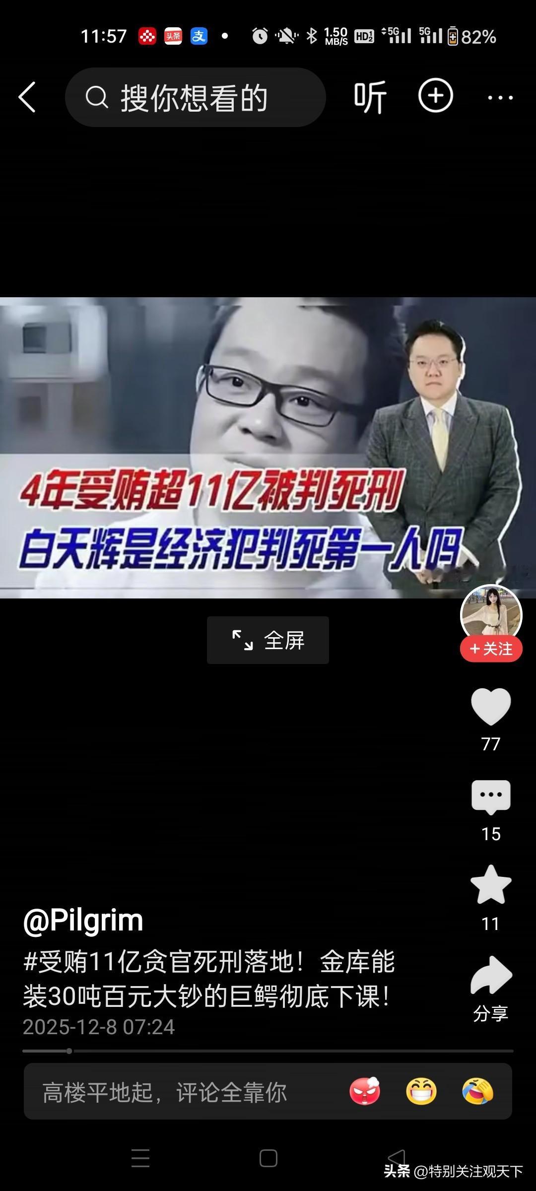 白天辉受贿11亿,被执行死刑!成第一。 要那么多钱干嘛?太贪了! 中国华融国际控股有限公司总经理白天辉被执行死刑 经最高人民法院核准,2025年12月9日上午,天津市第二中级人民法院依法对罪犯白天辉执行了死刑。白天辉为中国华融国际控股有限公司原总经理,他利用职务之便,非法收受财物共计折合人民币11.08亿余元。2024年5月28日,天津市第二中级人民法院以受贿罪判处被告人白天辉死刑,剥夺政治权利终身,并处没收个人全部财产。白天辉上诉后,天津市高级人民法院经开庭审理,维持原判。 这起案件因其涉案金额巨大而备受社会关注,一经执行死刑的消息传出,便登上第一,引发网友热议,大家纷纷对如此巨额的受贿行为表示谴责,认为其太过贪婪。这一案件也再次彰显了我国打击腐败、维护社会公平正义和法治尊严的坚定决心。 天津市第二中级人民法院收到最高人民法院的刑事裁定书和执行死刑命令后,依法对罪犯白天辉宣判并执行死刑。临刑前,白天辉与其近亲属进行了会见。 网友热议支持巨贪法院判决死刑, 贪腐关乎社会公平正义、关乎党的民心向背、关乎社稷存亡,必须高压、铁腕、以雷霆手段,坚决铲除,绝不姑息!👊🏽