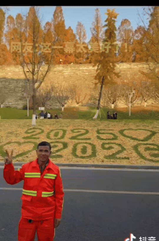 🔥火上人民日报了! 江苏南京,这个冬天因为环卫大叔的一个举动,让南京这座城市变得既浪漫又温暖。网友:价值2000万的事,被工资2000元的环卫大叔做了。 南京玄武门城墙旁的神武路,金光的银杏叶落满了绿化带内的草坪。环卫大叔刘金顶,看到许多人来拍照,观看景色,就想着给落叶做一个造型。他在铺满落叶的草地上,写出了“2025❤️❤️2026”的字符。这一幕被网友拍下来,发到了网上。 吸引更多的人去打卡拍照。还有许多外地的朋友,也都要去南京旅游。都要去看看环卫大叔做的落叶造型。 网友说,这哪是环卫工爷爷啊?这是被扫帚耽误的“城市美学大师”吧!一把扫帚扫落叶,扫出的是南京深秋最暖的彩蛋——别人眼里的“垃圾”,在他手里是给城市贴的“秋日限定贴纸”。 还有网友说,环卫大叔用银杏叶铺出的“爱心 2025”和“爱心2026”。这不仅是城市里的温柔细节,更藏着普通人对生活的热爱——把日常工作变成治愈人心的小美好,让平凡日子里充满善意与诗意。 环卫大爷的小举动,提醒了我们美好的事物就在身边,我们珍惜当下的生活。拥有一双发现美的眼睛,身边处处是美景。