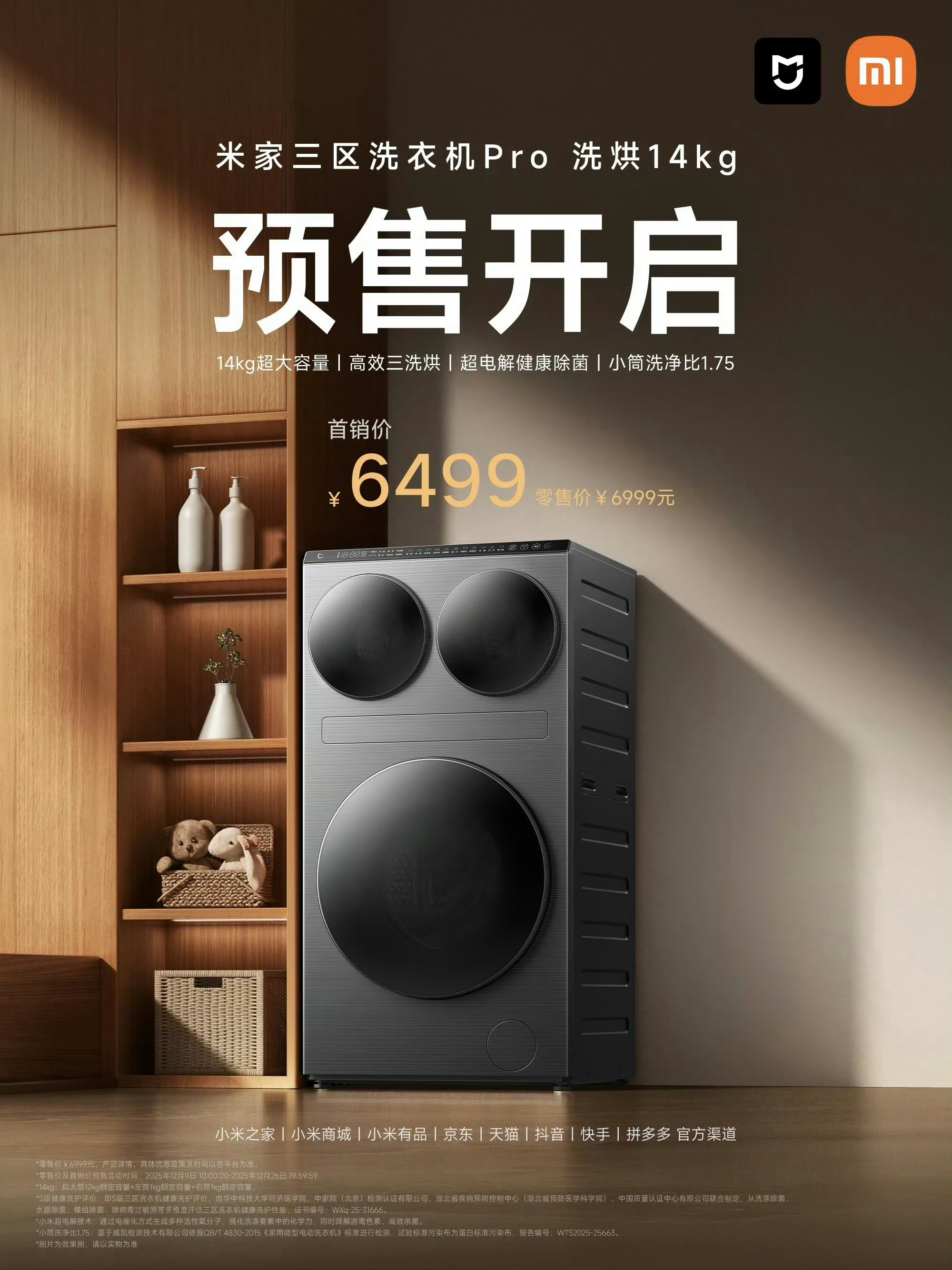 米家新三区洗来了,这次小桶升级到了1kg,为12kg主+2个1kg小桶,主桶支持12kg洗+9kg烘,洗净比1.3;小筒专业健康洗烘,1kg洗+0.5kg烘,洗净比1.75。我个人觉得1kg的小桶才更实用,这样可以单独洗一些比较大件的东西,比如秋衣秋裤、单件的外套和裤子,甚至枕头套啥的。当然这个14kg三区洗也更大,如果你要做嵌入式,或者在洗衣机上弄柜子,要提前量好尺寸。