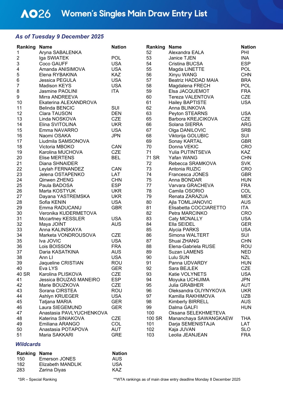 澳网2026公布单打正赛入围名单📜世界第一萨巴伦卡领衔,凯斯开启卫冕之旅。郑钦文、王欣瑜和张帅直接入围正赛,王雅繁、卡·普利斯科娃、萨王凯使用保护排名出战,琼斯、曼德利克和迪亚斯已经锁定外卡。作为新赛季的第一项大满贯赛事,澳网将在1月18日-2月1日进行。