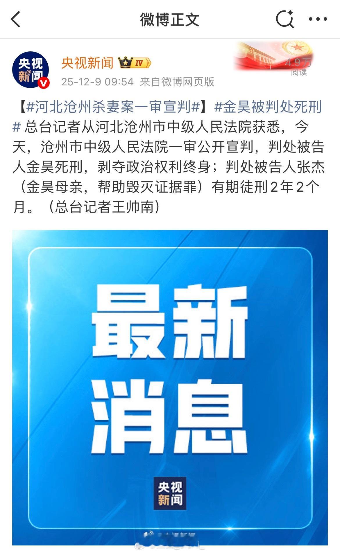 金昊被判处死刑河北沧州杀妻案宣判,金昊死刑!热点现场